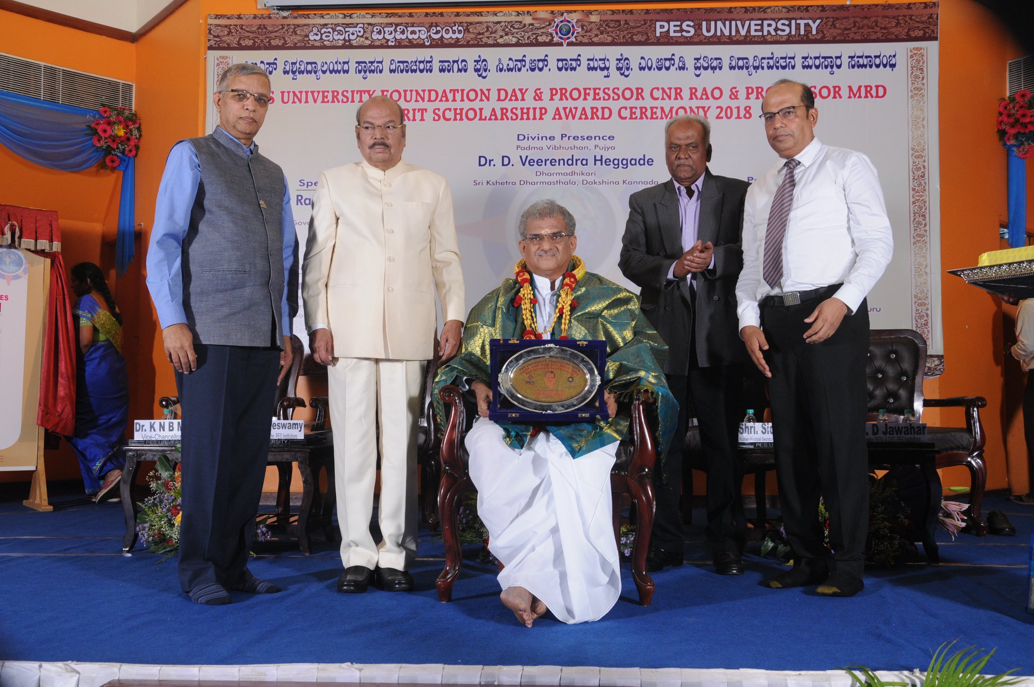On PES University foundation day, Prof. CNR Rao and Prof. MRD merit scholarship award ceremony was held at PES University premises today evening. Padma Vibhushana Dr. D. Veerendra Heggade, Dharmadhikari of Shri Kshetra Dharmasthala was a chief guest for the function. Dr. Heggade felicitated two students, who excelled in GATE 2018 and JAM as well as a female student, who won Ekalavya award by Government of Karnataka. He also awarded Prof. CNR Rao and Prof. MRD scholarship awards to toppers in each department. Dr. Heggade, in his speech appreciated and thanked Dr. Doreswamy for his yeoman contribution to the field of education. PES has achieved a tremendous growth within a short span of time and the credit must go to Dr. Doreswamy. He also recalled that during the early years of post independence, the opportunities were less in India in higher education. But now there are lots of opportunities. A country can develop and succeed only though creating opportunities for its youngsters. He appreciated PES University in recognizing the meritorious student and encouraging them with monetary incentives. He inspired students to take a pledge in becoming the partners of growth, instead of beneficiaries of growth.