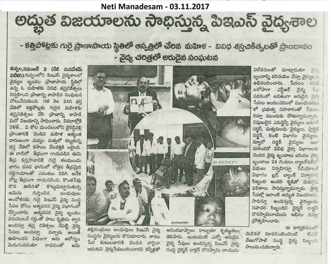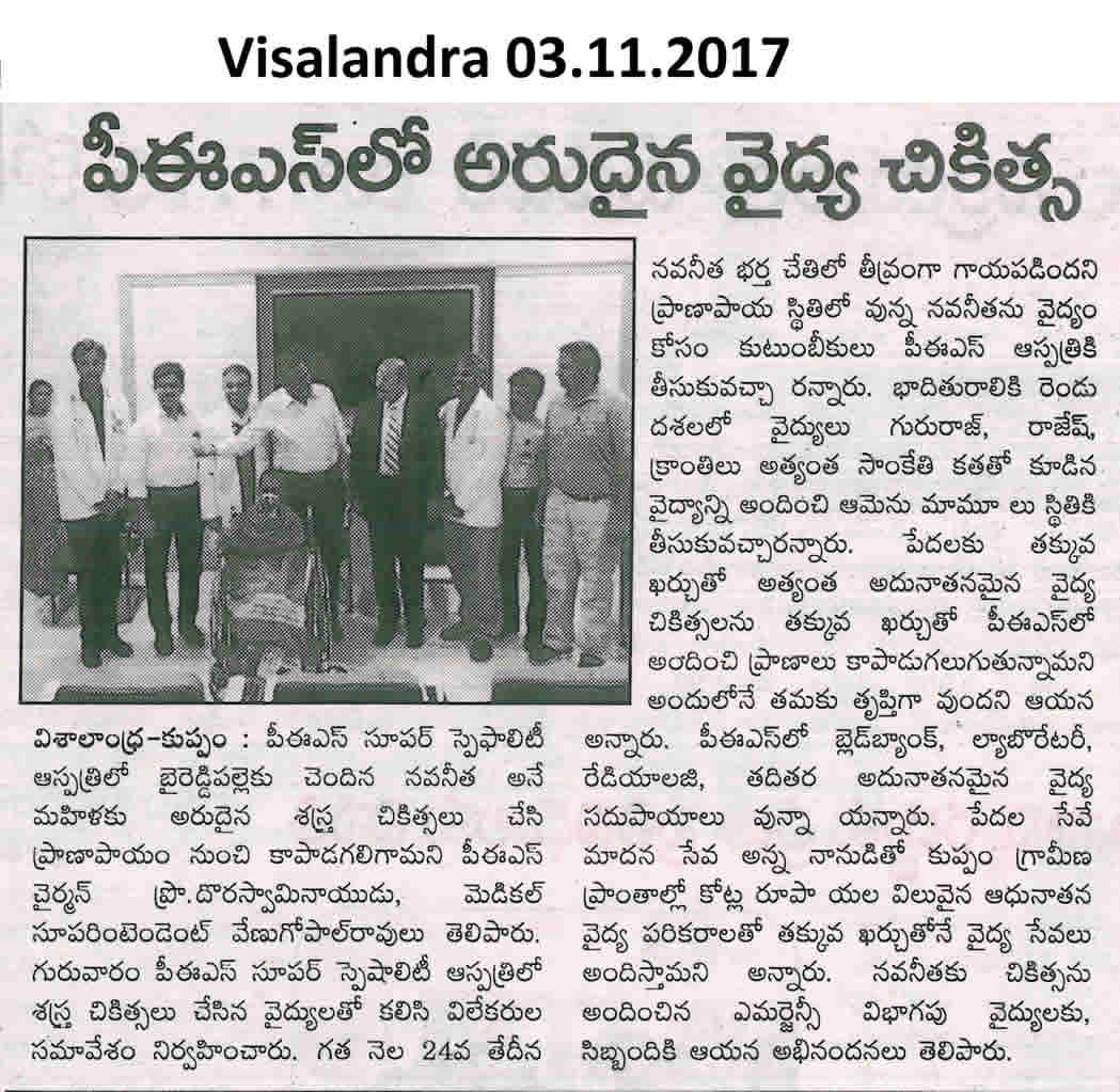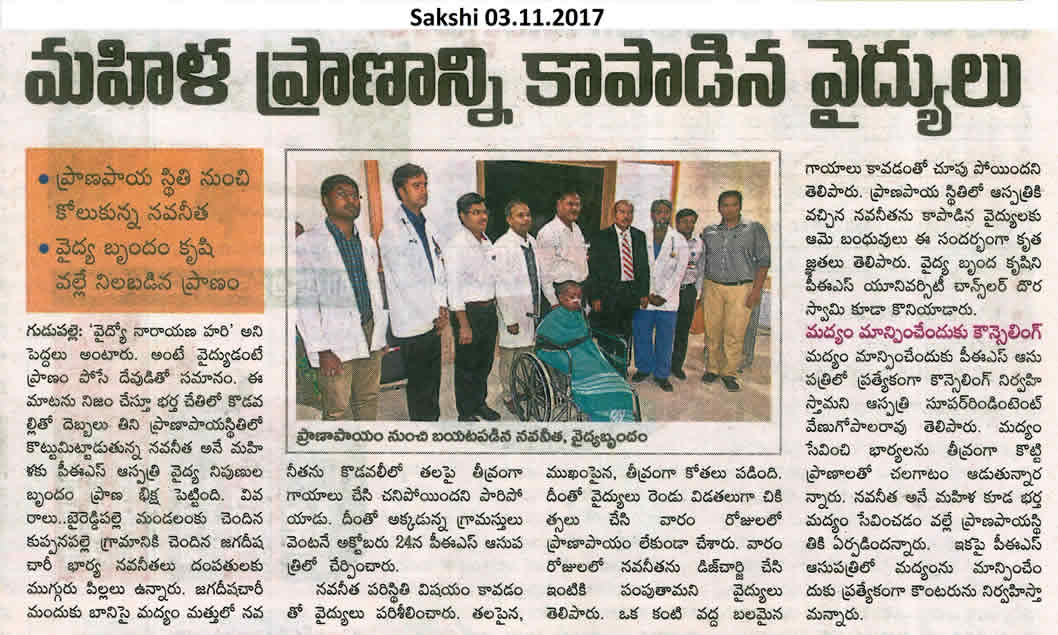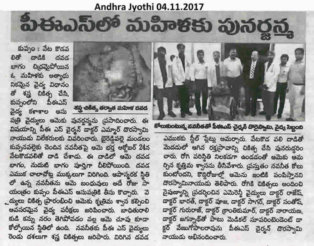 Doctors at PES Institute of Medical Sciences & Research, Kuppam Campus undertook a complex surgery that was performed in two stages in the form of reduction of multiple mandible fractures and fixation with plate and screw. The patient had suffered multiple facial and scalp injuries resulting in fall back of tongue and airway narrowing and difficulty breathing and suffered a head injury with intracranial bleed. The team of doctors included: Dr. Rajesh (Emergency Physician), Dr. Gururaj (Plastic Surgeon), Dr. Kranthi Kumar (Neuro Surgeon), Dr. Santosh (Anaesthetist), Dr. Jagganath (ICU Specialist) and Dr. Bharat, Dr. Pooja and Dr. Sagar (General Surgeons).