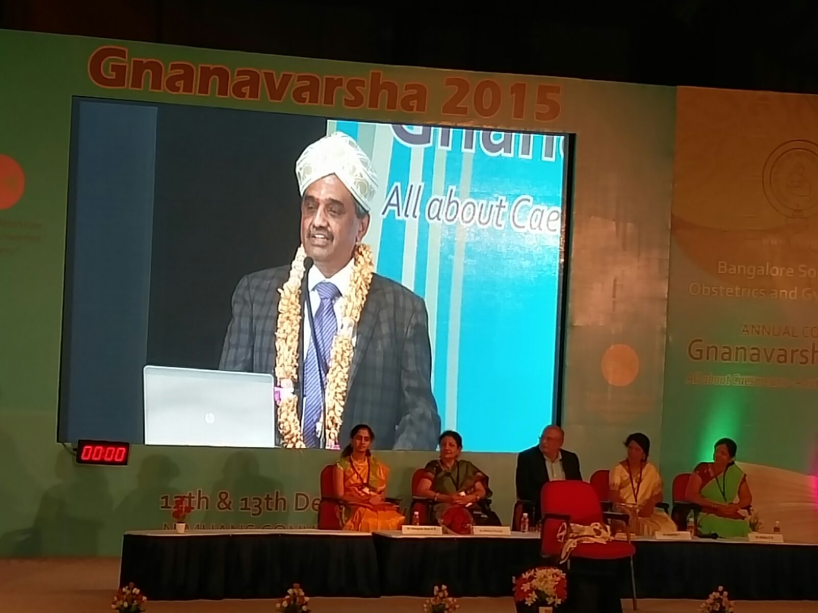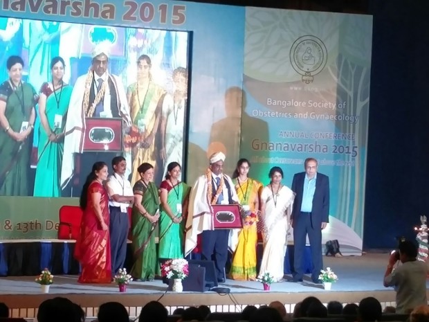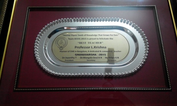 Dr. L Krishna, Medical Superintendent & Professor of OBG, PES Institute of Medical Sciences & Research, Kuppam was felicitated with “BEST TEACHER” award by Bangalore Society of Obstetrics and Gynaecology (BSOG) on 12/12/2015.