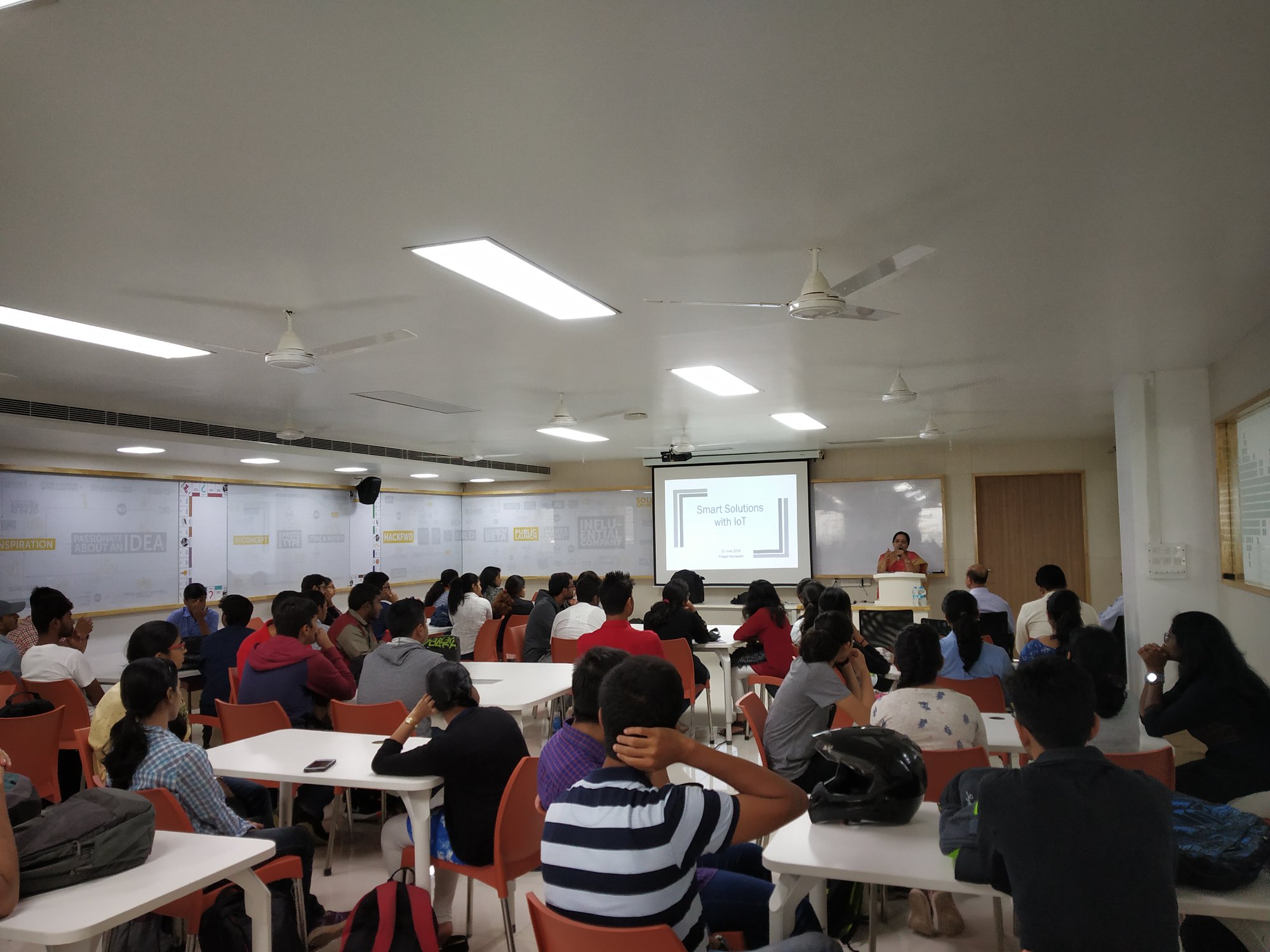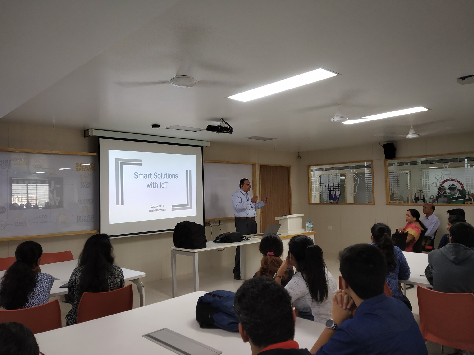 Students participated in a two-day Workshop combined with one-day Hackathon to learn and implement smart solutions using IoT at PES University. Over 60 students participated in the event held from June 22 to 24, 2018 in CIE Studio at PES University. This program provided a unique hands-on experience of sensors and actuators, edge computing and cloud environments.