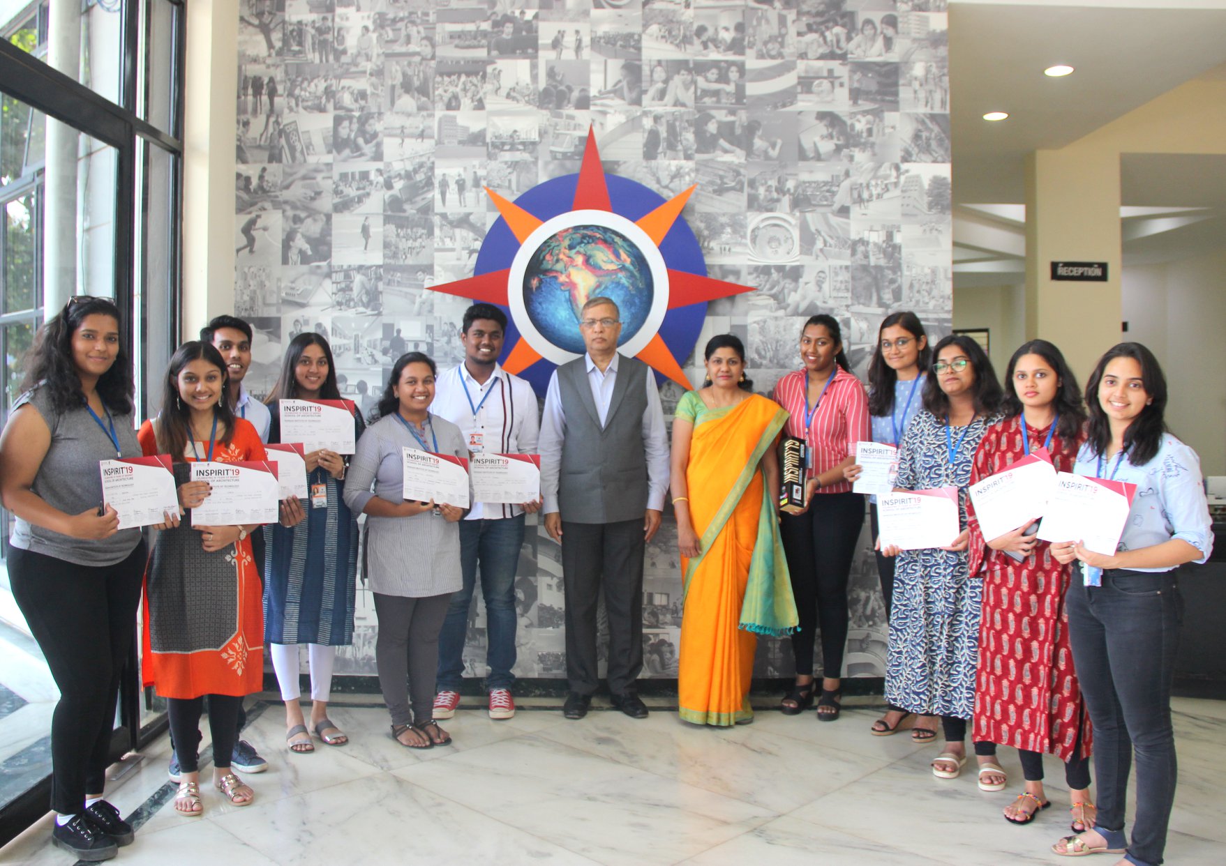 Students of architecture program won prizes at Inspirit 2019. Roshini and Anagha won first place in Architectural Journalism. Shreya and Aditi won first place in Revive. Ritesh won first place in Shutterup. Ruthu and Mahima won first place in COLOUR MAKING. Akshatha and Akshara won first place and Mahima and Ruthu won runner up place in KNEADING COLOR. Arvind and Nishitha won first place in CHOP and POP. INSPIRIT 2019 - An Architectural Fest was organised by School of Architecture, RAMAIAH INSTITUTE OF TECHNOLOGY on 29-30 March, 2019.