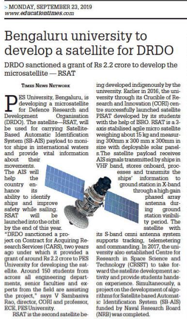 PES University, Bengaluru, is developing a microsatellite for Defence Research and Development Organisation (DRDO). The satellite—RSAT, will be used for carrying Satellite-Based Automatic Identification System (SB-AIS) payload to monitor ships in international waters and provide vital information about their movements. (Sep 23, 2019, Education Times)