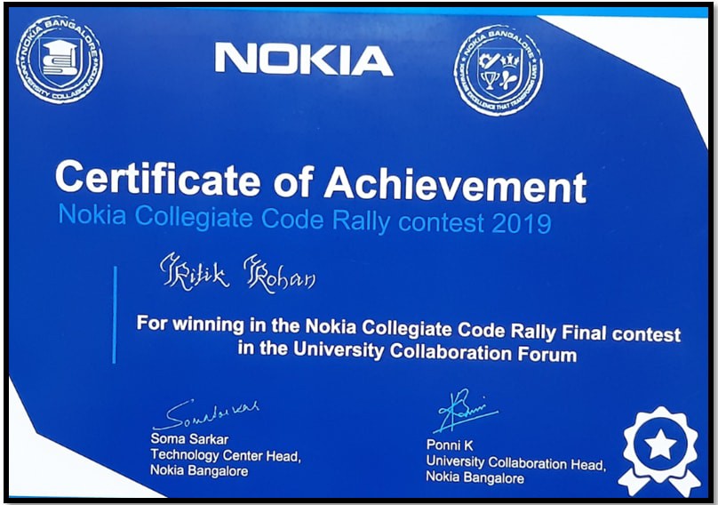 Ritik Rohan won the Nokia Collegiate Code Rally Contest 2019 conducted by Nokia Technology Centre. The contest draws participation from universities across India and this is the second time in a row that PES students have won the title. Dr Anuradha M, Chairperson, Department of ECE handed over the certificate and Amazon Echo. Ritik seventh semester student of ECE program.