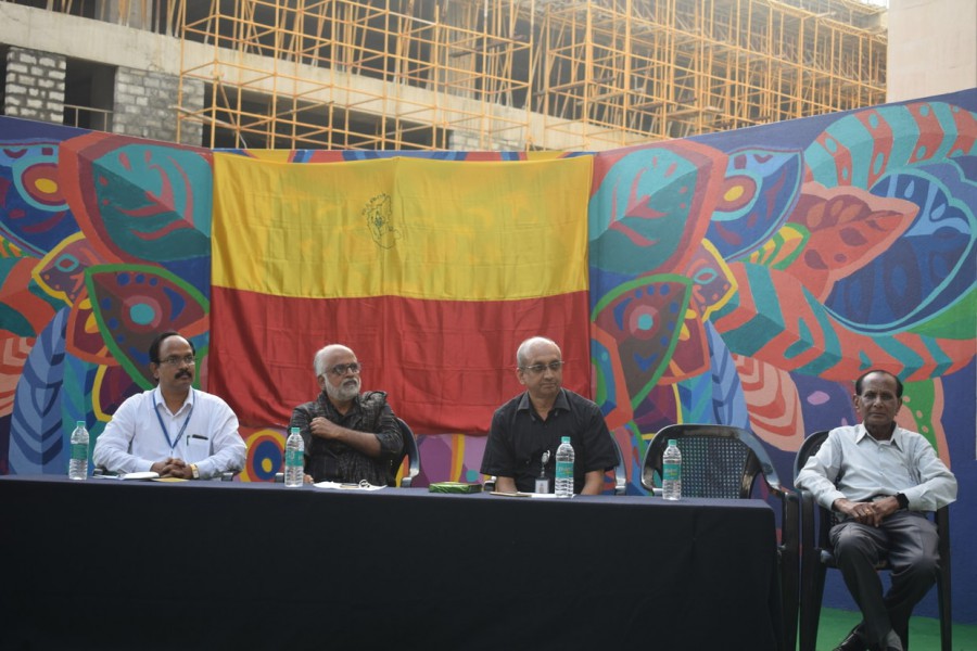 PES University celebrated Kannada Rajyotsava today through keeping a talk by chief guest, who is a well known theatre artist, director and author Sri Babu Hirannaiah as well as the release of a translated book ‘Vishnupriyadevi’ by Professor G. Sathyanarayana. After hoisting a flag, Sri Hirannaiah spoke on how we could express our love and respect for kannada language through talking, sharing with non kannadigas and reading kannada books and papers. He also said that we can’t make others to learn Kannada through force, but talking and respecting the other culture and language. Mr. Upadhyaya spoke on the Vishnupriyadevi and how it represents a culture and tradition of Indian society of the medieval period.