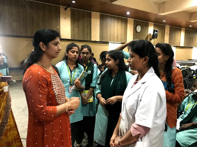 Dr. Mallika Natraj, Breast Oncologist, Sparsh Hospital Yeshwanthpur Bengaluru, created awareness on Breast Cancer, its causes, preventive measures and also briefed the audience on prevalence, incidence, and dietary influence. She rolled out statistics to prove the alarming increase in breast cancer cases in recent years. Demonstrative videos to explain how to carry out Self Breast Examination (SBE) were shown and advised the girl students & women employees on the measures to be taken to protect themselves from the dreadful disease.