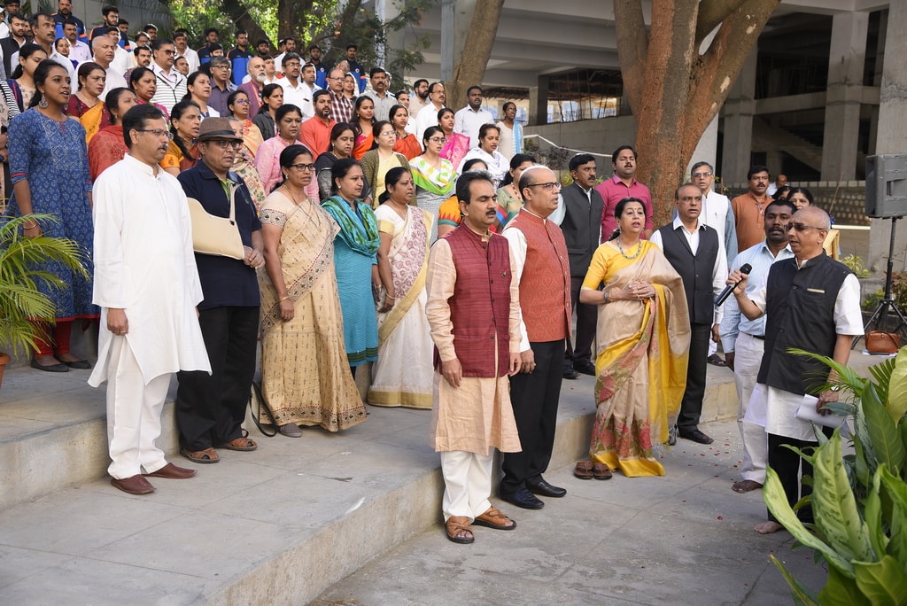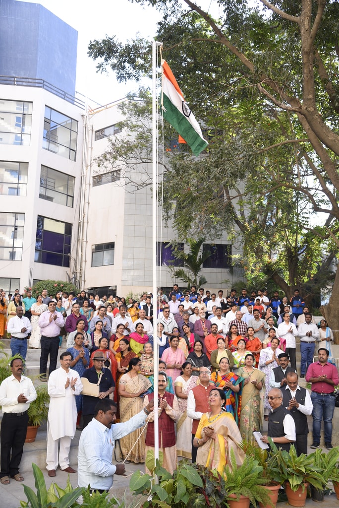 Dr. Suma Sudheendra, renowned Veena exponent, hoisted the National Flag and spoke on the cultural values and said it is important for students to be proud of India. She stressed that the rich and diverse culture of India reflect and shape values, beliefs, and aspirations and said it defines our national identity. She recalled her interactions with PESians who had volunteered during SAAC1980’s at her recent USA tour and said they were all in eminent positions at premier IT industries. She expressed PES’s key role in shaping their future. She also marked that PESians are serving the State, Bharat and the Global Village – World. She called upon young PESians to take up initiatives including conservation of environment by volunteering for plastic free campus, home, city, state and there by Swaach Bharat. The 3 C’s namely: Commitment, Consistency and Courage will play a vital role in the success of the individual and thereby the nation she added. Finally, she spoke on her "India Music Experience museum", FOURTH museum in the world dedicated to music which runs on the formula of ‘see, hear, touch and discover’ which is a must-visit for music buffs and extended an invite to all PESians.