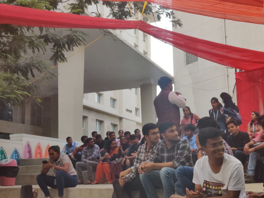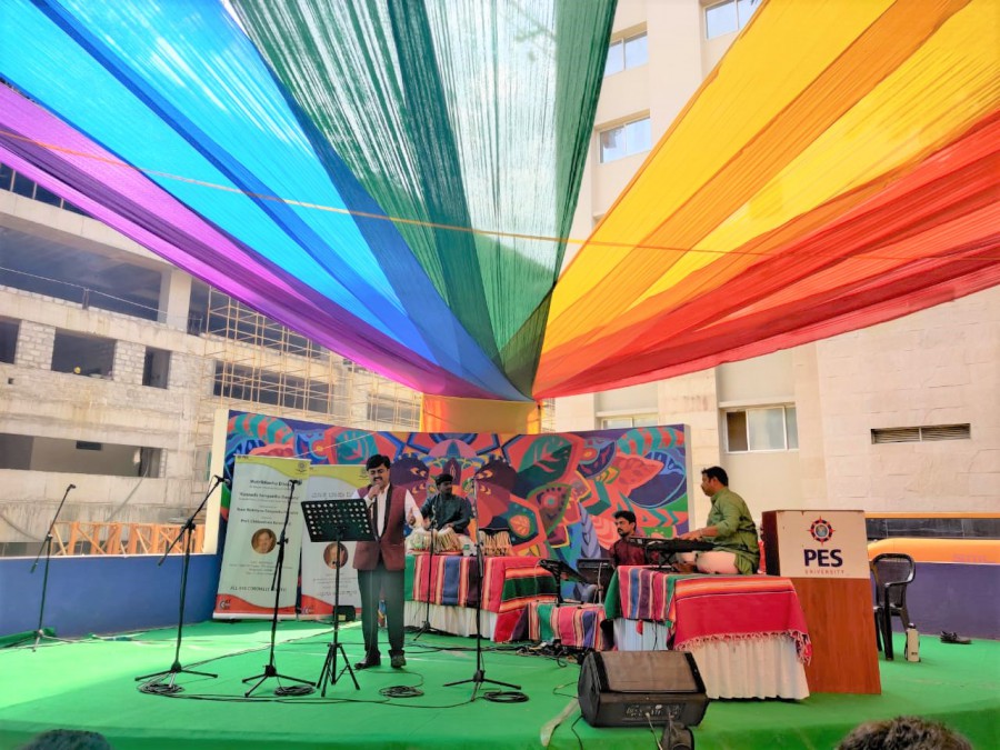 They were accompanied by Punyesh on keyboard Maruti tabla and Umaprasad on rythm pad andcoordinated by Prof. Chidambara Kalamanji performed a compilation of Kannada songs from all genres for two hours. The event which started at 2:10pm started with Dr. V Krishna giving a welcome address highlighting the greatness of Kannada. Later Dr. Chidambara Kalamanji and troupe took over for an absolutely energising performance. The event was attended by many faculty of the PES University Ring Road Campus. The event was also graced by the Vice Chancellor Dr. J Suryaprasad. The event went up to almost 5:00pm. Students and faculty alike were up on their toes and sang to the numbers played by the troupe.