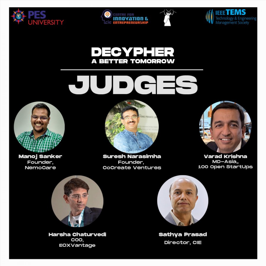 Centre of Innovation and Entrepreneurship (CIE) organized “Decypher: A Better Tomorrow”, a 48-hour virtual hackathon in association with the Entrepreneurship Cell (ECell) for all students at PES University. The hackathon started at 5 PM on Jun 12 and ran 48 straight hours ending on Jun 14 evening. The objective of Decypher was to enable cross-disciplinary teams to come up with innovative product &/or solution ideas that could make a difference in the post-COVID world.