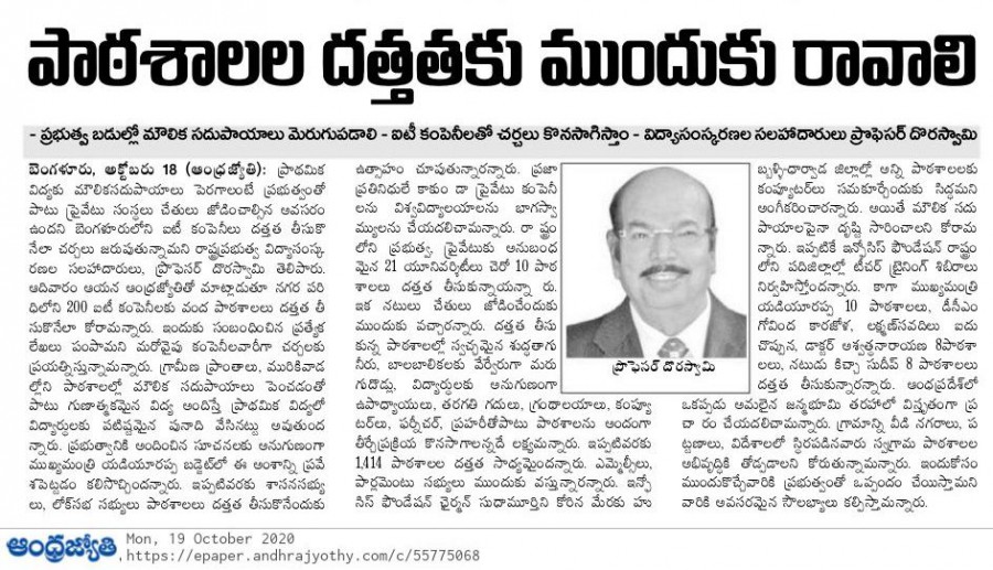 Even reputed cine artists have agreed to participate in the scheme. This social recognition has prompted Dr. M.R. Doreswamy to seek the participation of 200 reputed IT companies to leverage school education services by adopting government schools commensurate with their preeminent status.