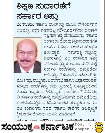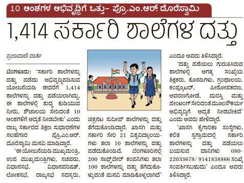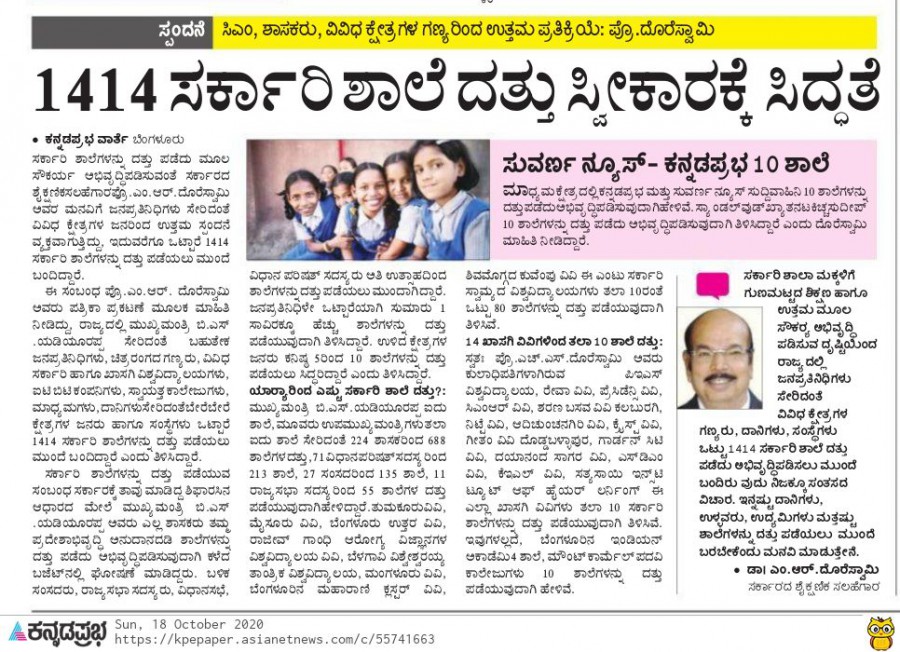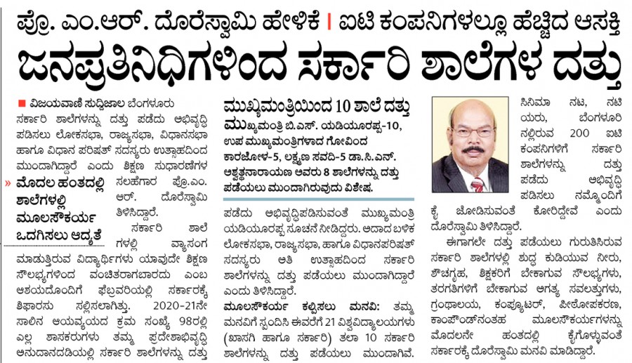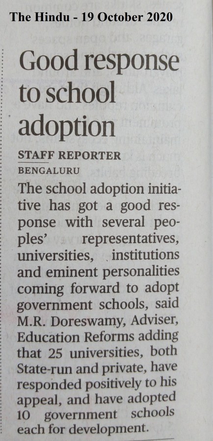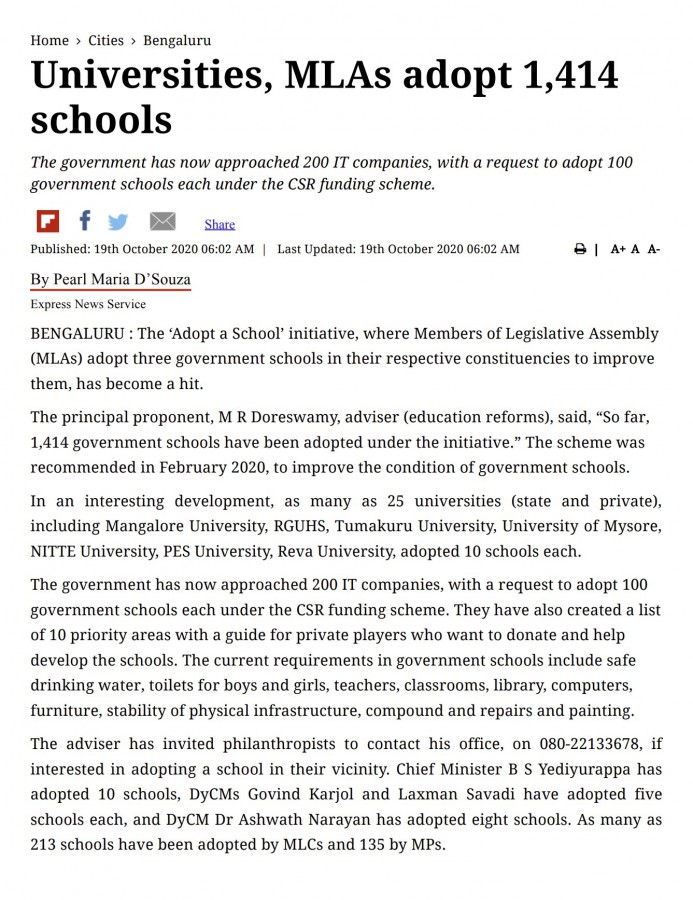 Dr. M.R. Doreswamy has succeeded in giving a big push to the government's school adoption policy, first by getting the nod of the legislature in the budget session of 2020-21 for all the MLAs to adopt 3 government schools for development under the Legislators’ Area Development scheme. In his press release, Dr. Doreswamy, Education Advisor, GoK has said that the scheme is now wider acceptance with all the MLCs (3 schools), MPs (5 schools) and Rajyasabha members (5 schools) coming forward to adopt schools for development in their respective constituencies. The press release also says that 25 universities (both state and private) has adopted 10 government schools each, thus taking the scheme across different sections of society.