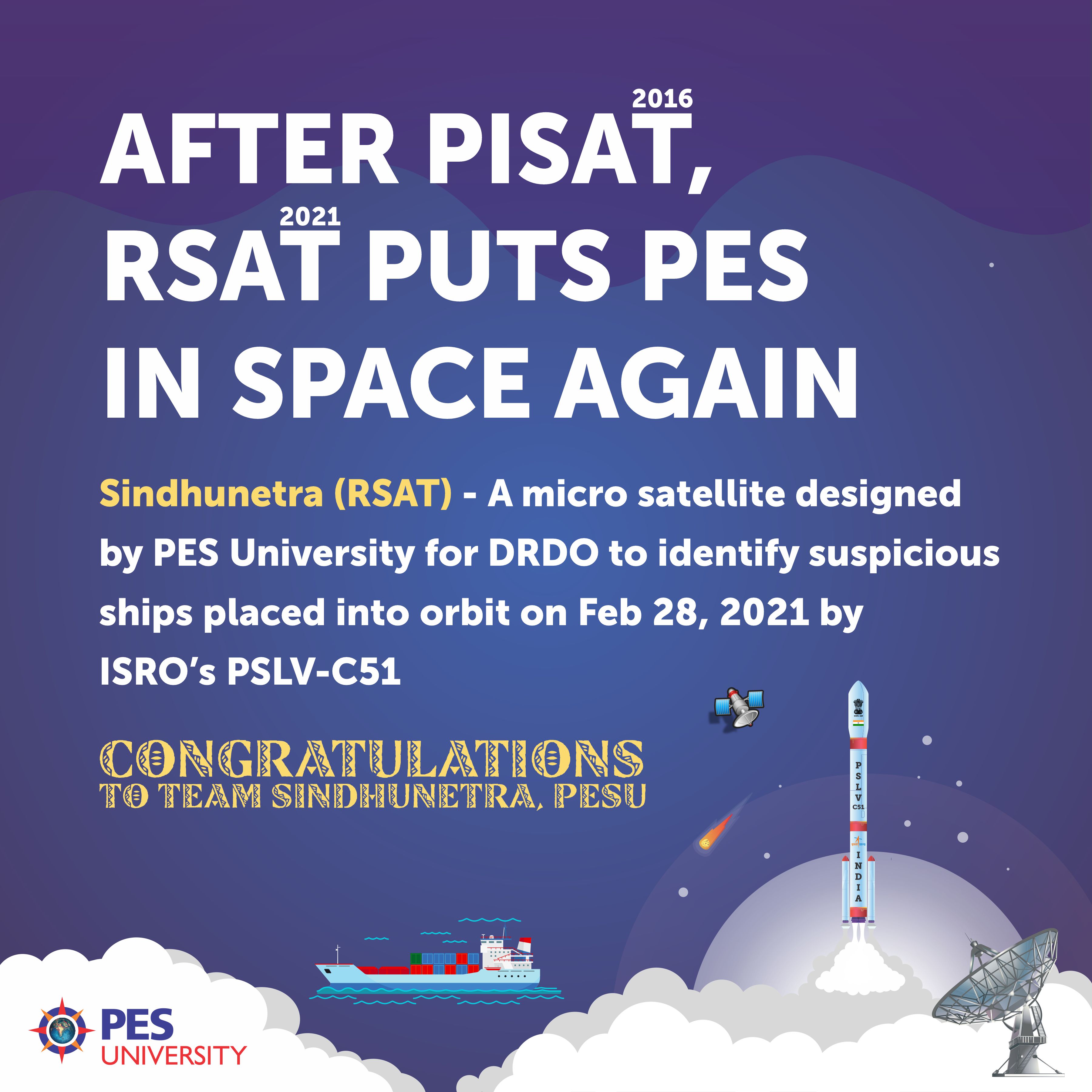 RSAT designed by PES University is officially named as Sindhunetra, an Indian technology demonstration satellite funded by Defence Research Development Organisation's (DRDO) research centre Imarat, Hyderabad to identify suspicious ships. It is considered as one of the important ships of PSLV. Sindhu Netra (RSAT) was injected successfully and signals were received from Sindhu Netra and Satellite is in good health. Till now Satellite is doing well and RSAT team of PES University is monitoring and controlling the Satellite.