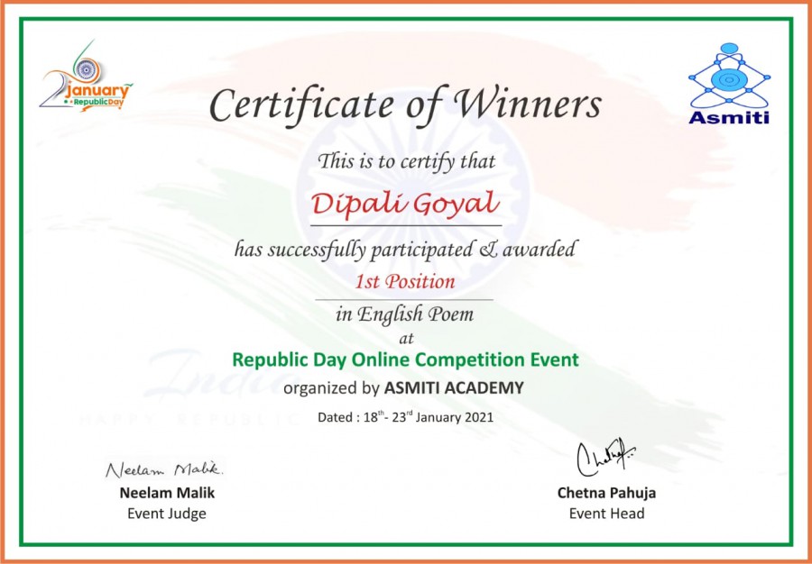Dipali Goyal bagged the first prize in the English poetry writing competition conducted online as part Republic Day Celebrations by Asmiti Academy.