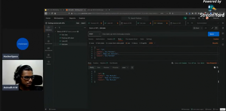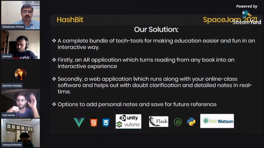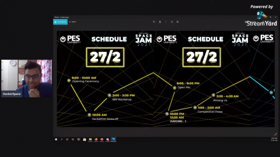 HackerSpace club of the university launched SpaceJam 2021, the first annual flagship hackathon featuring general and freshers tracks besides Matic Ethereum, Portis, Tezos, Postman, and EchoAR tracks. The hackathon was hosted on Devfolio. Discord was used for announcements, mini events and first round of judging. The first round of judging was conducted by the mentors to select the top 15 teams that qualified for the final rounds. As preparation for the event, Prarthana MJ, AI consultant for Supply Chain solutions working with IBM Insights and Intelligence Expert Labs conducted a hands-on workshop on IBM Watson studio and Services and Anirudh Murali, the student expert for Postman explained how to get started with APIs. General Track Winners included: first place bagged by Team FullSmash of Yajat Vishwakarma, Ayush Kapasi, Nalin Dang, Harsh Karanwal, second place by Team LeoCode of Prajwal Adsul, Rohit Chaudhari, Viraj Jadhav, and third place by Team Rubber Ducky of Tushar Magar, Yash Mutnalkar, Vibhav Samaga. Freshers Track Winners included: first place bagged by Team Error 404 of Shreyas Kaundinya, Sarath Sundar, Achyut Raghavan, Ajay Kumar, second place by Team SudoCode of Amritha Pallavoor, Anant Gulati, Amanpreet Pawa and third place by Team Astrocoders of Dhruv Chawla, Rahul Samal, Abhiram Manohara, Sreyas S. The competition was judged by Kavitha Yogaraj, Data Scientist, IBM Quantum, Prasanna Anantharamaiah, Managing Director, Checkpoint Software Systems, Abhilash Ramakrishna, CTO, Haldoc and Shitalkumar Panse, Co-founder and Director, IOTLYNX. The opening ceremony and the final judging rounds were live streamed on Youtube. SpaceJam 2021, 24 hour hackathon, the first iteration of the annual flagship event of HackerSpace as held on Feb 27-28, 2021.