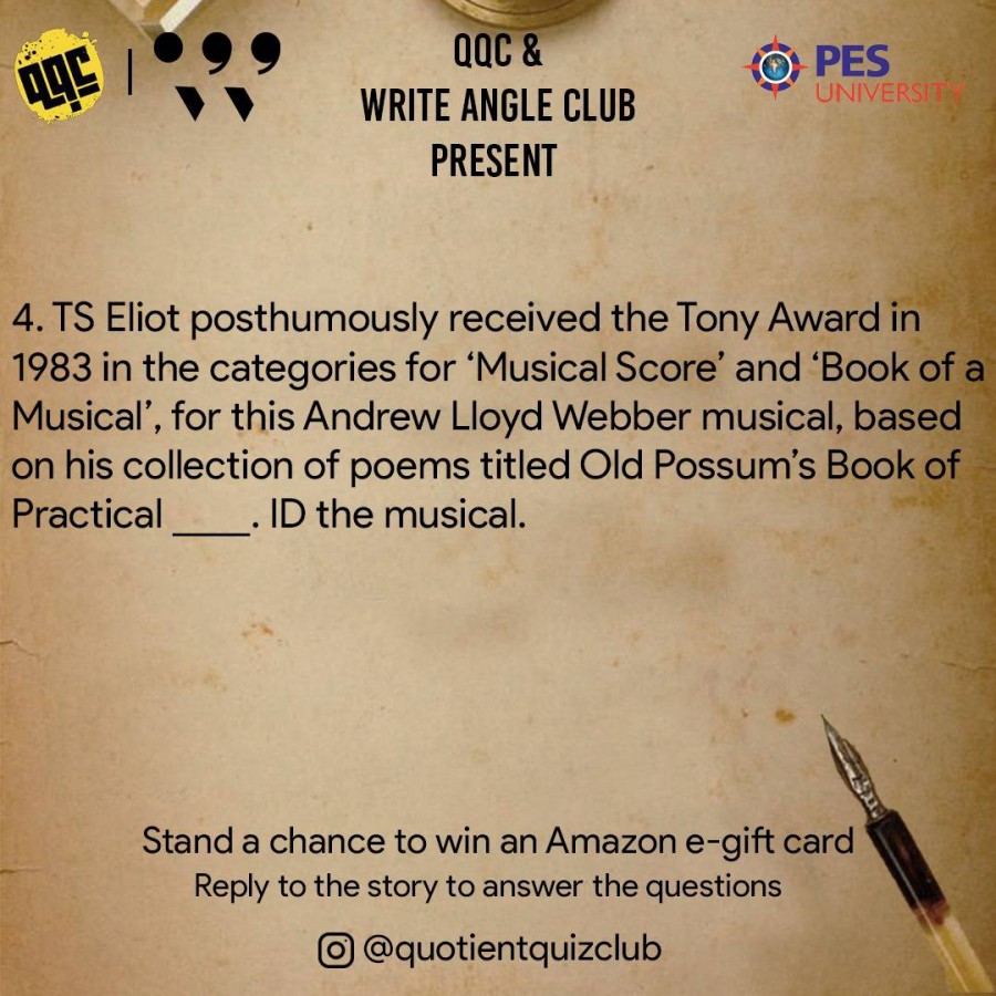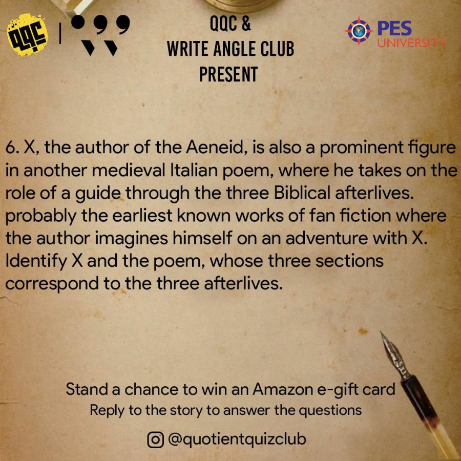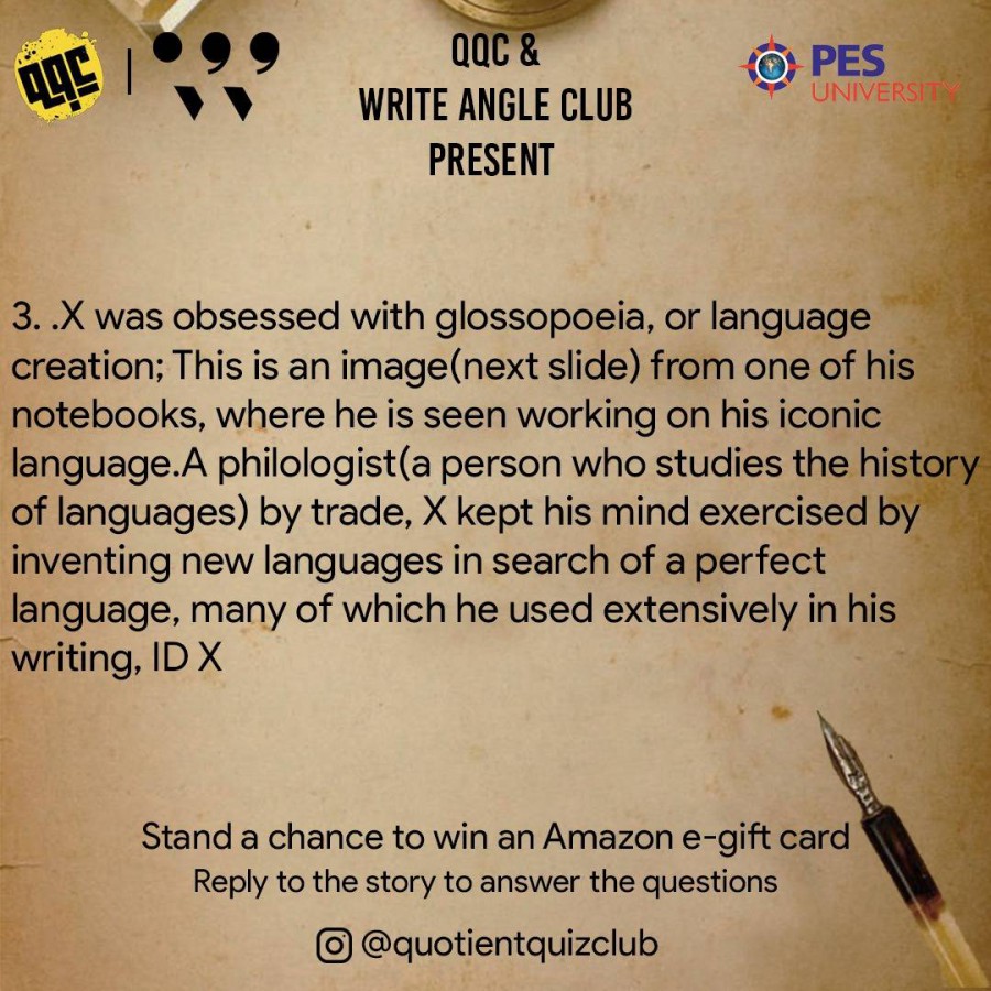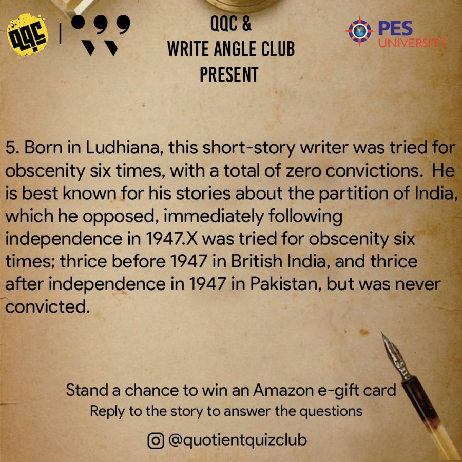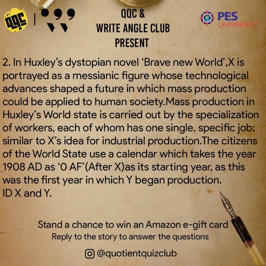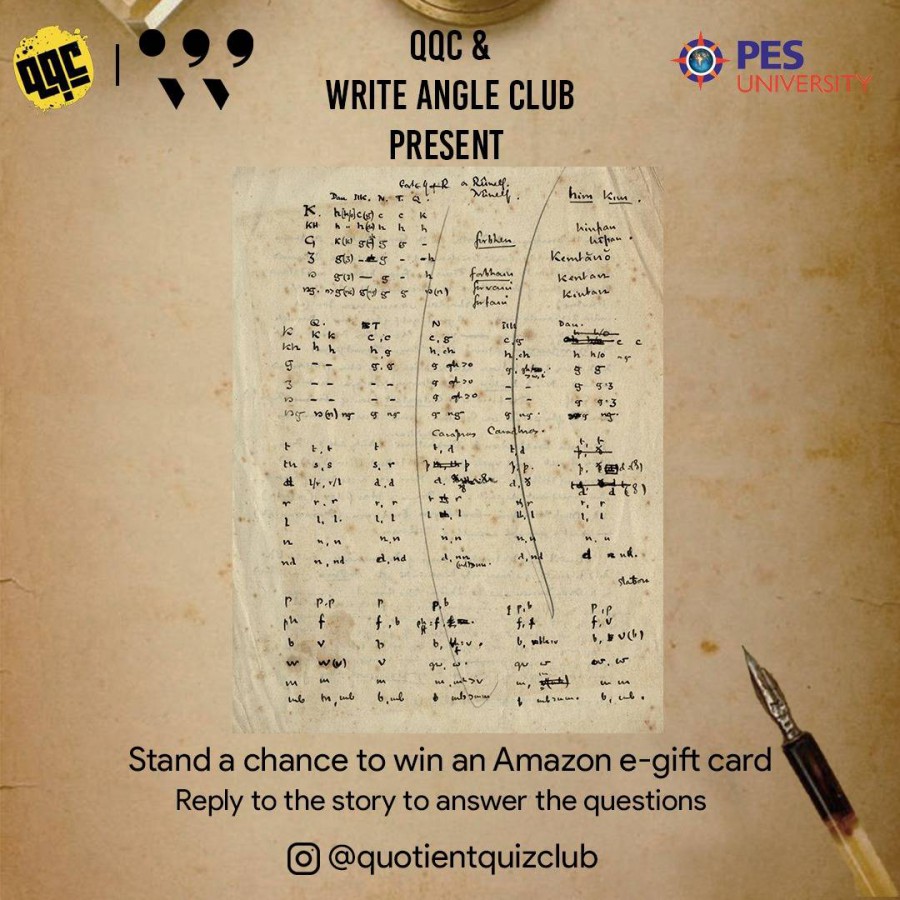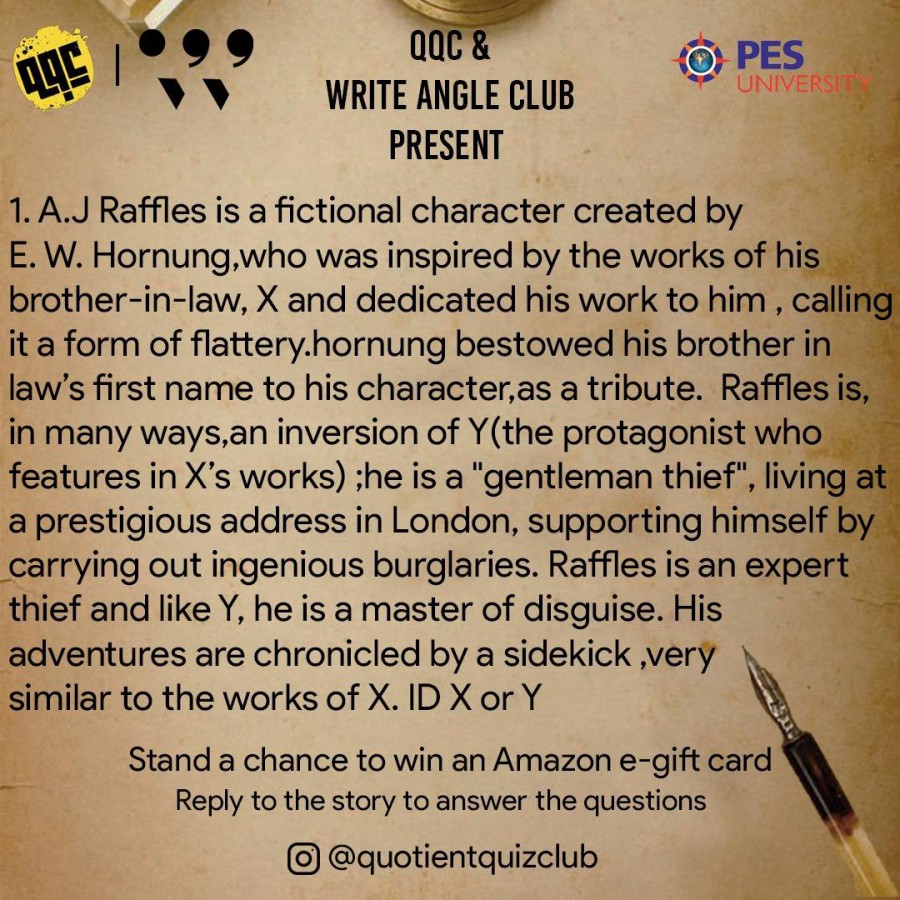 The quiz tested the awareness of participants about the many fields of literature, including crime fiction and dystopian novels. The questions posted on Instagram gathered answers as private replies from over 406 accounts. The top prizes were won by Kumar Shivam of Gauhati University, Athira of PESU RR Campus and Arvind S Sambhu of Sree Gokulam Medical College. The event was jointly organised by Write Angle and Quotient Quiz clubs on May 29, 2021.