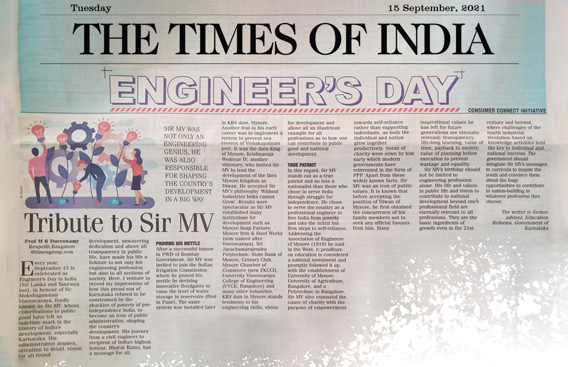 Every year, 15th September is celebrated as Engineers’ Day in India (Sri lanka and Tanzania too), in honour of Sir Mokshagundam Visvesvaraya, fondly known as Sir MV, whose contributions to public good have left an indelible mark in the history of India’s development, especially to Karnataka. His administrative acumen, attention to details, vision for all round development, unwavering dedication and above all transparency in public life have made his life and times a folklore to not only his engineering profession but also to all sections of society, from citizen to all those at the cutting edge of public administration. Here, I venture to record my impressions of how this proud son of Karnataka, refused to be constrained from the shackles of poverty of pre-independence India, to become an icon of public administration, shaping country’s development for all round development. His journey from a civil engineer to be a recipient of India’s highest honour, Bharata Ratna has a message for all, not just the engineering profession.