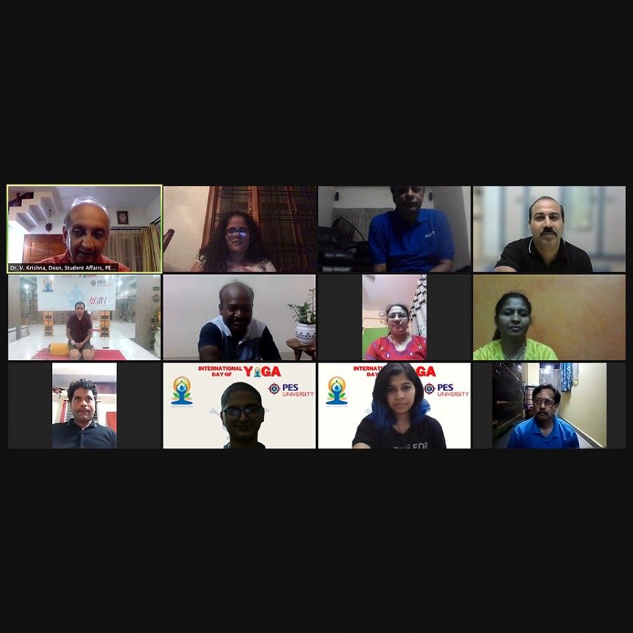 Yoga is acknowledged as the physical, mental and spiritual practice that originated in India. The ancient Indian practice is guiding people around the world in discovering the sense of oneness with self, world and nature. PM Narendra Modi first proposed the idea which gained prominence in a short span of time and resulted in this international day. Dr M R Doreswamy is an active proponent of yoga. From the year 2010 yoga has been a part of curriculum at the university and students practice Yoga regularly at PES campuses. At the celebrations on HN campus, chief guest Aacharya P C Mukunda Rao, renowned Yoga therapist in his thought-provoking speech highlighted the importance of yoga in developing one’s body and mind. He recommended practice of yoga systematically and following a proper procedure regularly to experience the health benefits. The on-line and live audience performed Yoga exercises as part of the program. At the celebration on RR campus, Shri Rajesh Kumar, a certified yoga trainer and evaluator from the Ministry of Ayush engaged the participants in a hands-on session with various Yogic exercises. The details of the asanas were compiled in an instructional packet of instructional videos and documents. The final asana of the evening was the inverted pose, involving a combination of nine asanas. The evening ended with participants applauding the International Yoga Day celebrations, and pledging to make yoga part of their daily lives.