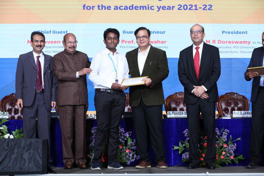 In his presidential address, Dr. M.R. Doreswamy, Chancellor of PES University narrated the 50 years of Journey of PES starting from PU College to a University that has been ranked No. 1 in the State and one among Top 100 Universities in India. He said the discriminating factors that make PES Unique are Quality and value based education, learning environment with best teachers and supporting infrastructures, mentor system, placement opportunities and merit scholarships. He highlighted on the significance of attracting talented industry professionals to join academia for teaching which has also been aptly said by the New Education Policy. There by establishing a strong bondage between industry and academia as this is the need of the hour. He called upon the aspirant engineers to follow great personalities like Sri M Visvesvaraya. He said PES is in the verge of celebrating its Golden Jubilee during the year 2022. He added that PES is coming up with a medical college with a 300 bedded super speciality hospital that would cater to the needs of 100 villages in and around electronic city with the affordable medical charges.