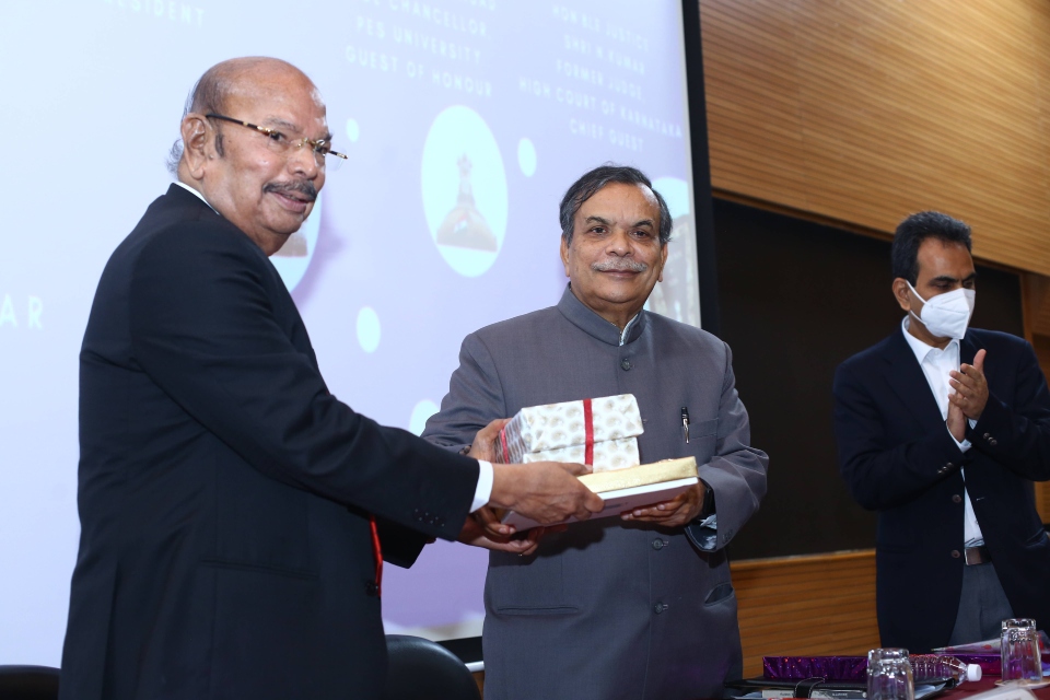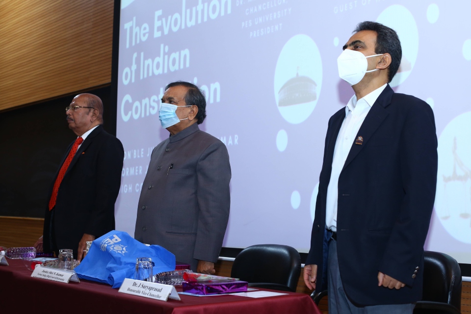The Faculty of Law, PES University, Bengaluru celebrated the Constitution Day on 26th November 2021 to commemorate the adoption of the Constitution of India on this day in 1949. A special lecture was organised with Justice Shri. N. Kumar, former judge, High Court of Karnataka, as the chief guest Dr. J Surya Prasad, Vice Chancellor, PES University as guest of honour and Dr. M R Doreswamy, Chancellor, PES University as the president of the function.