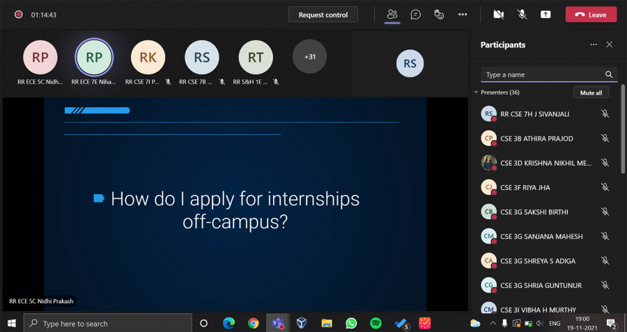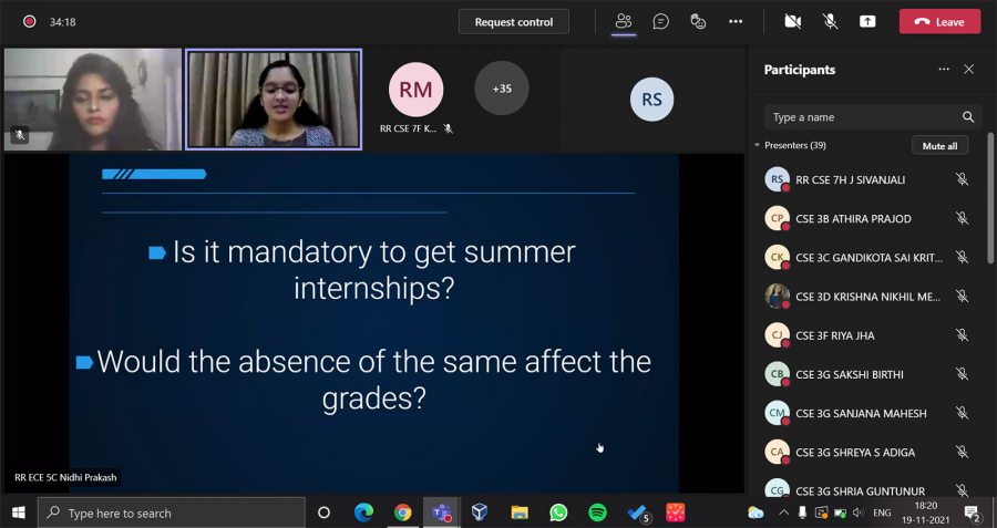 Students who had secured internship offers from esteemed organizations like Morgan Stanley, Antstack Technologies, Visa International, Nasdaq and IISc interacted with other aspiring students. They shared their experiences and shed light on various aspects of applying for internships like skills required, resume strengthening, and the process of interview. The Internship Talk was organized by ACM-W PESU Chapter on Teams on November 19, 2021.