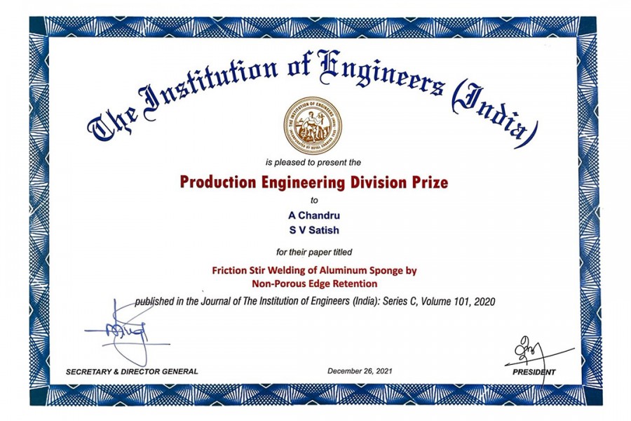 Research paper titled Friction Stir Welding of Aluminum Sponge by Non-Porous Edge Retention authored by Dr. S.V. Satish and Prof. A.Chandru which was published in the Series C Journal of IEI, Vol. 101, Issue 5 was presented the Production Engineering Division Prize by the Institution of Engineers (India) at the 36th Indian Engineering Congress held at New Delhi on December 26, 2021.