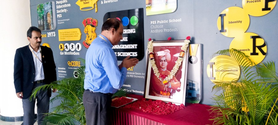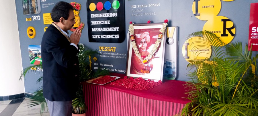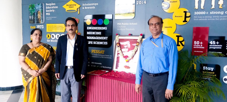 Prof. J Surya Prasad, Hon’ble Vice Chancellor, and Prof. K S Sridhar, Registrar, PES University offered floral tributes to the portrait of Swami Vivekananda.