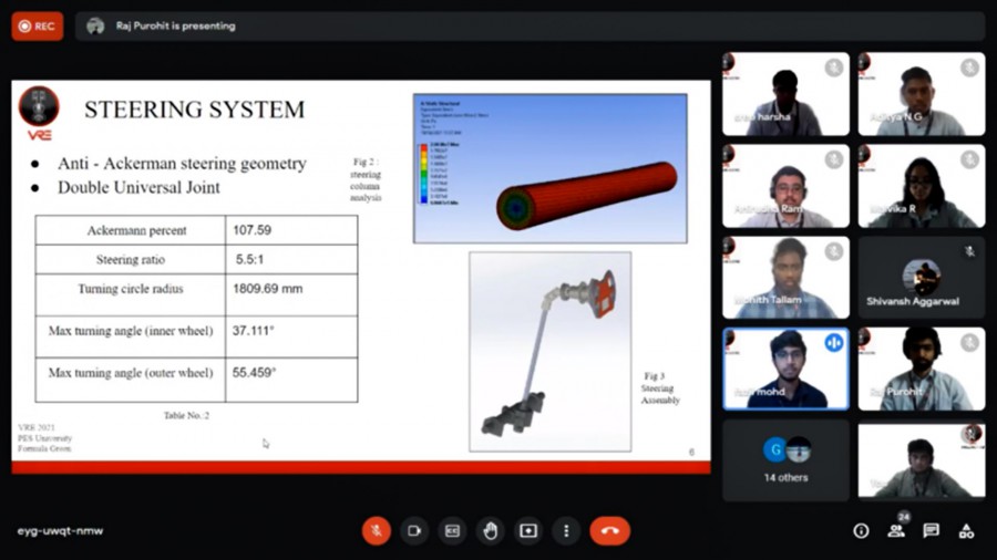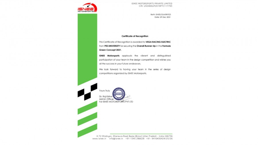 The open cockpit electric race car designed and built by Vega Racing Electric, the electric formula student team of PES University, RR Campus, secured overall runner-up position in Formula Green Concept 2021 competition. The team finished third in the cost event and second in the design event. Raj Purohit won the Best Team Captain Award. The participants competed in cost, business plan and design presentation rounds. They were assessed for understanding of the costs related to manufacturing, viability of business strategy using the current car as a prototype and grasp of technical nuances and creativity in creating a race car while conforming to the technical criteria set forth in the rule book. A total of 9 teams from all over India participated in the Formula Green Concept 2021, which was held online from October 23 to 31, 2021. Award ceremony video link.