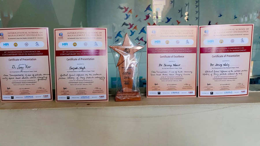 Narendra, Suman, Indira, Brijesh and Jessy Nair presented research paper titled, Spiritual Gurus’ influence on customer purchase intention of FMCG products. Sai Krishna, Shashank H and Jessy Nair presented research paper titled, Clean Transportation: A case of private community spaces based Electric Vehicle charging facilities which received the Best Paper Award. ISME Business School, Bangalore organized the 10th International Conference on Contemporary Issues in Management on February 26, 2022.