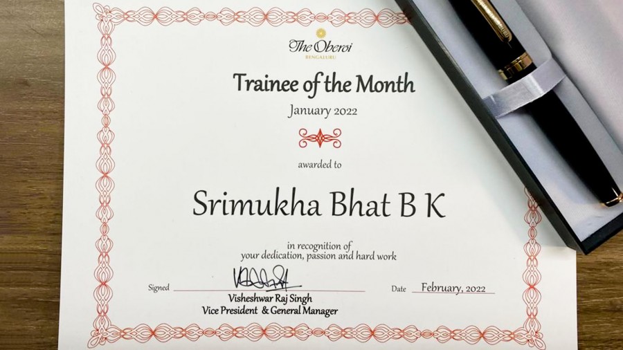 Srimukha Bhat, a student of final year BBA HEM was recognized and felicitated by the Oberoi Hotel, Bangalore as the best trainee.
