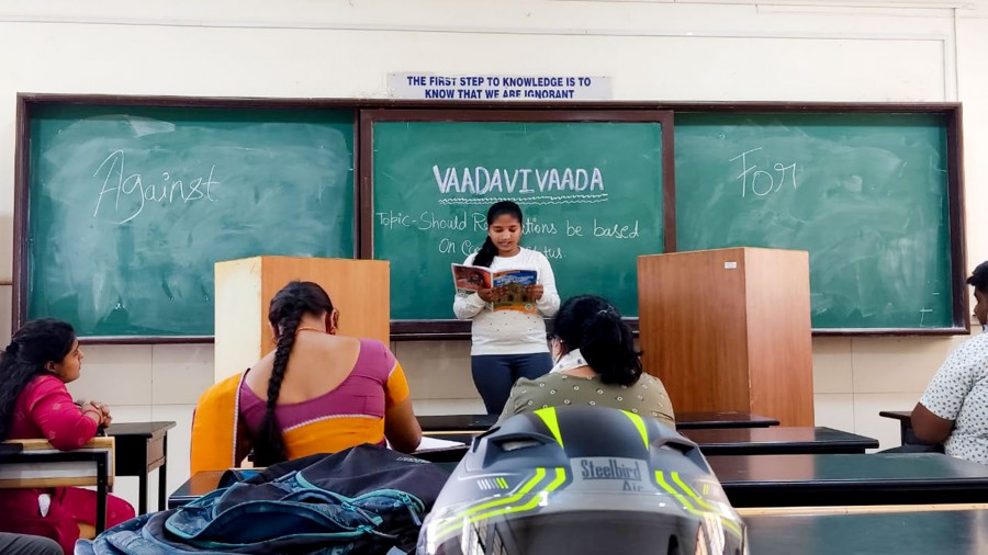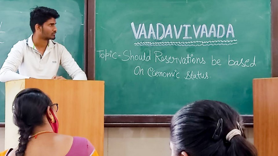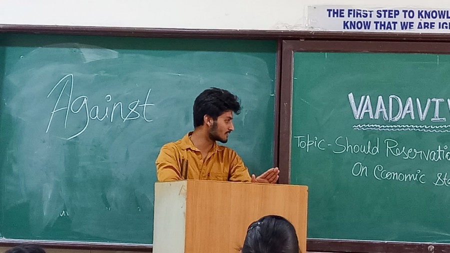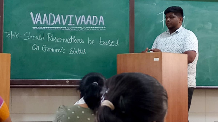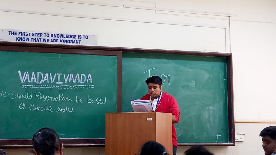 The pros and cons of our nation’s policy on reservations in education and services based on economic status was discussed with forceful arguments by the debaters. Varshitha. V won the first prize followed by Rajath.N and Nisarga. V at Objection! My Lord! debate organised by Vadavivada, the debate club at HN campus on March 10, 2022.