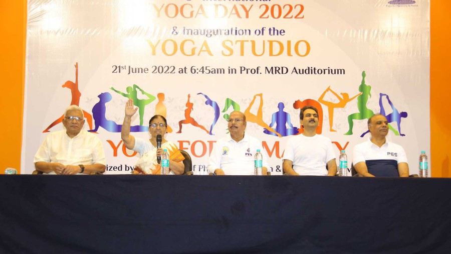 Dr. K.S. Sridhar, Registrar of PES University welcomed the guests. Dr. Anupallavi, a Yoga instructor in the Department of Sports demonstrated and taught a few yoga asanas and pranayama to a large audience.Later, the chief guests inaugurated the Yoga studio, a state-of-the-art facility within the campus. Sri Vinay, Director of sports, delivered the vote of thanks. Dr. J. Surya Prasad, Vice-Chancellor of PES University graced the occasion.