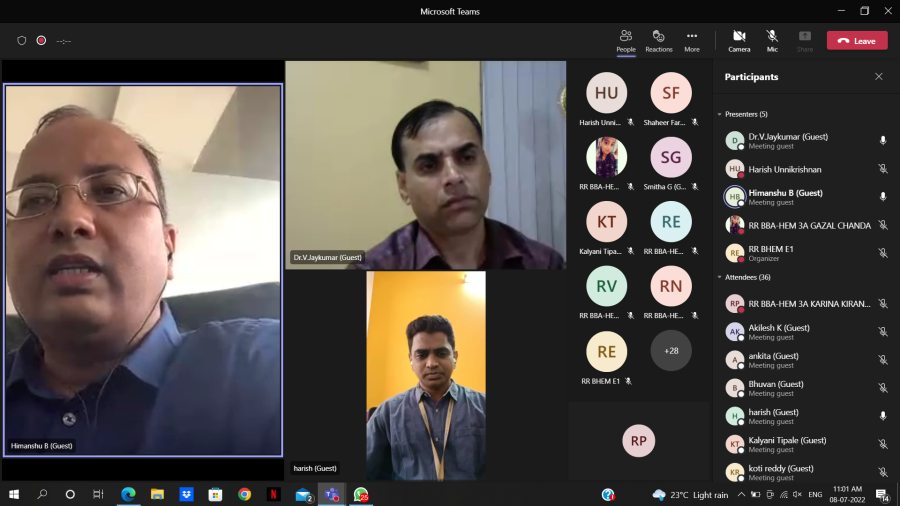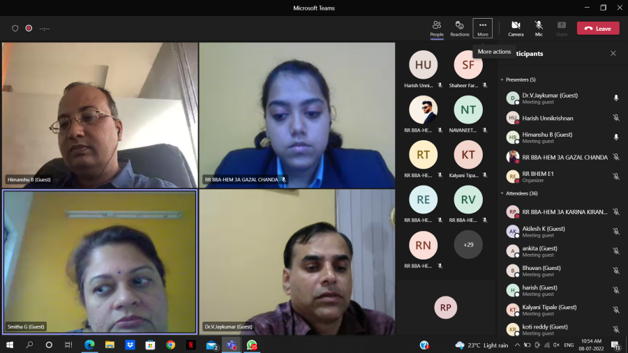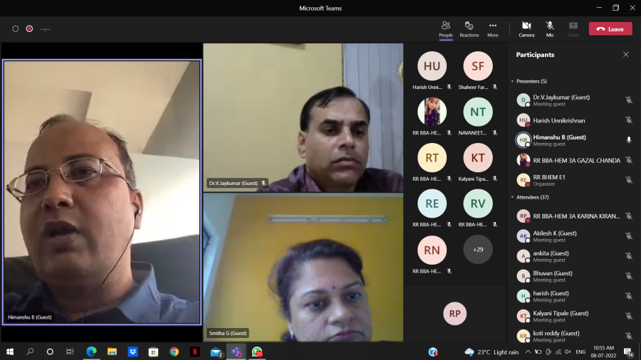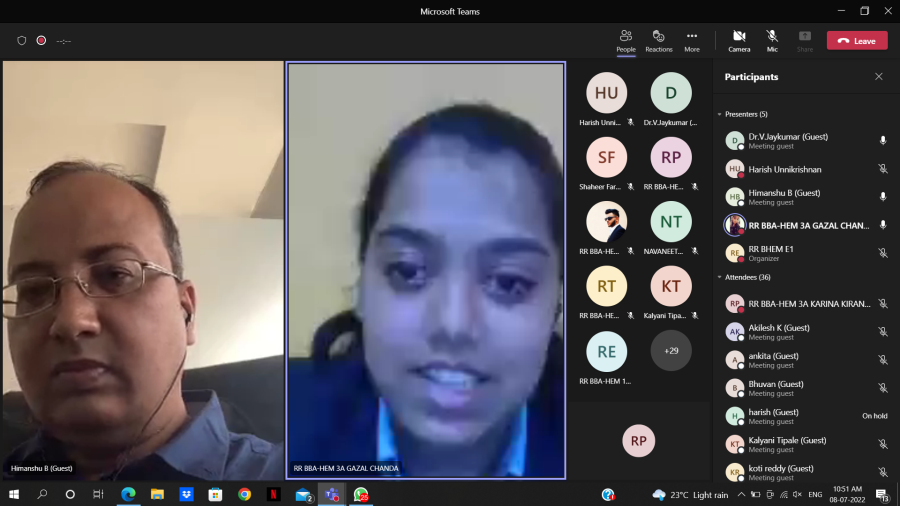 The webinar series titled Parivartana featuring eminent experts from different domains who are committed to bringing about meaningful changes in the community started with a session on environment sustainability. Mr.Himanshu Barola, CEO of Everything Recycles and a mentor in ATAL Innovation Mission elaborated on efficient reprocessing approaches, methods, and practices. The second session featured Mr.Pravesh Pandey, Vice President, Restaurant Success of Zomato elaborated on new ways to profitability in food ventures. The sessions in the change-makers series Parivartana, organised by the department of BBA HEM were held on July 8, 2022.