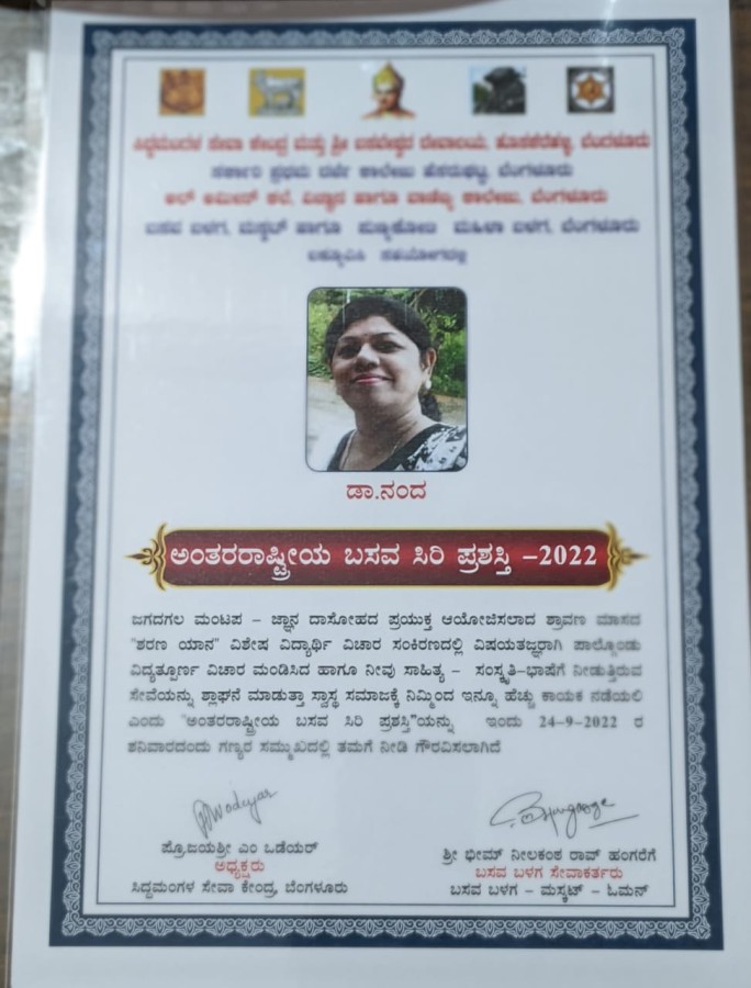 ಶ್ರಾವಣ ಮಾಸದ 30 ದಿನಗಳು ನುರಿತ ವಿದ್ವಾಂಸರಿಂದ ವಚನ ಸಾಹಿತ್ಯಕ್ಕೆ ಸಂಬಂಧಪಟ್ಟಂತಹ ಉಪನ್ಯಾಸಗಳನ್ನು ಶರಣ ಯಾನ ಕಾರ್ಯಕ್ರಮವನ್ನು ಏರ್ಪಡಿಸಲಾಗಿತ್ತು. ಮಸ್ಕಟ್ ಮತ್ತು ಓಮನ್ ಇಲ್ಲಿನ ಬಸವ ಬಳಗ ಸಮಿತಿ ಕಾರ್ಯಕ್ರಮವನ್ನು ಆಯೋಜಿಸಿತ್ತು ಇದರೊಡನೆ ಆಲ್ ಅಮೀನ್ ಕಾಲೇಜು ಹೆಸರುಘಟ್ಟ ಹಾಗೂ ಸಿದ್ದ ಮಂಗಳ ಸೇವಾ ಸಂಸ್ಥೆ ಗೂಗಲ್ ಮೀಟ್ ನಲ್ಲಿ ಪ್ರಾಯೋಜನ ಮಾಡಿದ್ದ ಈ ಕಾರ್ಯಕ್ರಮದಲ್ಲಿ ಹಲವರನ್ನು ಗುರುತಿಸಿ ಅತಿ ಹೆಚ್ಚು ಶ್ರೋತೃಗಳನ್ನು ಹೊಂದಿದ್ದು ಉತ್ತಮ ಕಾರ್ಯಕ್ರಮ ಹಾಗೂ ಅತಿ ಹೆಚ್ಚು ಪ್ರತಿಕ್ರಿಯೆ ನೀಡಿದ ಸಂದೇಶಗಳನ್ನು ಗುರುತಿಸಿ ಅವುಗಳಲ್ಲಿ ಹೆಚ್ಚು ದೇಶದ ಜನರು, ಆಸಕ್ತರು, ಭಾಗವಹಿಸಿ ಕಾರ್ಯಕ್ರಮವನ್ನು ಯಶಸ್ವಿಗೊಳಿಸದ್ದಕ್ಕೆ ಅಂತರರಾಷ್ಟ್ರೀಯ ಬಸವ ಸಿರಿ ಪ್ರಶಸ್ತಿಯನ್ನು ನೀಡಿ ಗೌರವಿಸಿದರು. ಕಾರ್ಯಕ್ರಮವು ಹೊಸಕೆರೆ ಹಳ್ಳಿಯ ಬಸವಣ್ಣನ ದೇವಾಲಯದ ಆವರಣ ದಲ್ಲಿ 24.9.2022 ರಂದು ಜರುಗಿತು. ಪಿಇಎಸ್ ವಿಶ್ವವಿದ್ಯಾಲಯದ ಕನ್ನಡ ವಿಭಾಗದ ಡಾ. ನಂದಾರವರನ್ನು ಮಸ್ಕಟ್ ಹಾಗೂ ಓಮನ್ ಬಸವ ಬಳಗದ ಅಧ್ಯಕ್ಷರ ಪರವಾಗಿ ಪ್ರತಿನಿಧಿಗಳು ಹಾಗೂ ಡಾ. ಶಿಲಾ ಮಳಿ ಮಠ ಮುಖ್ಯಸ್ಥರು, ಬಿಎಮ್ಎಸ್ ಕಾಲೇಜು ಇನ್ನಿತರ ಗಣ್ಯರು ಅಂತರರಾಷ್ಟ್ರೀಯ ಬಸವ ಸಿರಿ ಪ್ರಶಸ್ತಿ 2022 ನೀಡಿ ಗೌರವಿಸಿದರು.