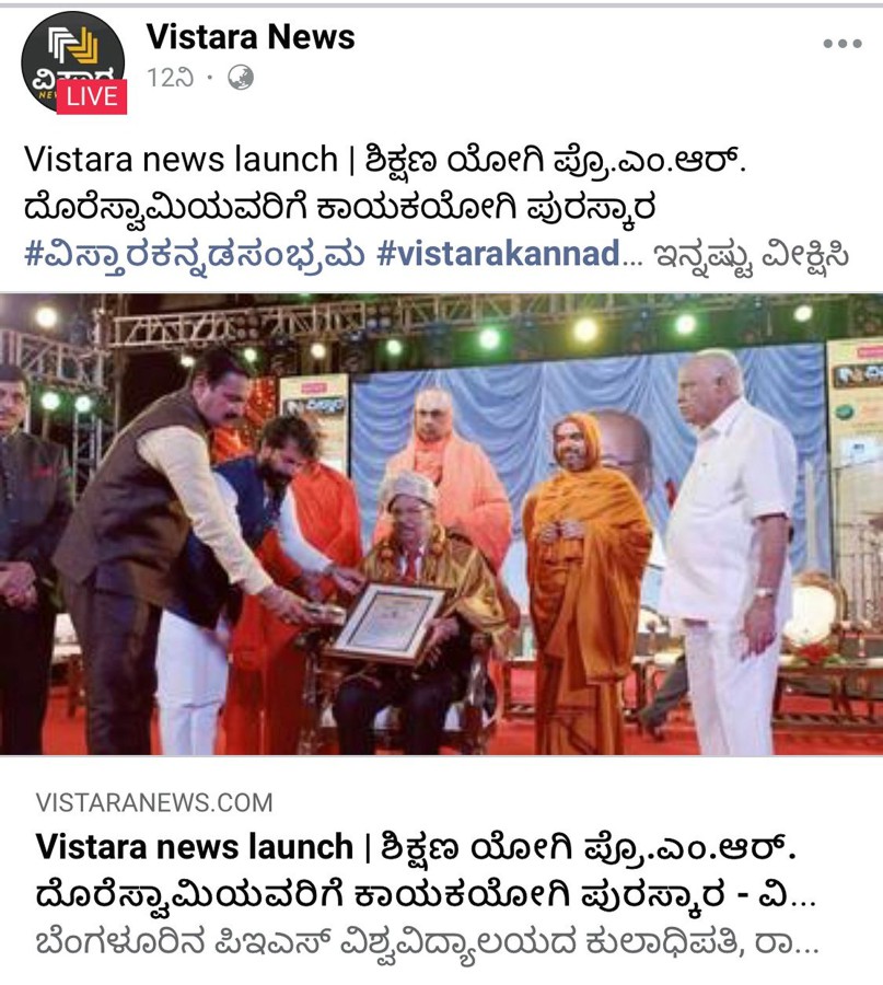 ಬೆಂಗಳೂರಿನ ಪಿಇಎಸ್ ವಿಶ್ವವಿದ್ಯಾಲಯದ ಕುಲಾಧಿಪತಿ, ರಾಜ್ಯ ಸರ್ಕಾರದ ಶೈಕ್ಷಣಿಕ ಸುಧಾರಣೆಗಳ ಸಲಹೆಗಾರರು, ಮಾಜಿ ಎಂಎಲ್ಸಿ ಪ್ರೊ.ಎಂ.ಆರ್. ದೊರೆಸ್ವಾಮಿ ಅವರಿಗೆ ವಿಸ್ತಾರನ್ಯೂಸ್ ಲೋಕಾರ್ಪಣೆ ಸಮಾರಂ೦ಭದಲ್ಲಿ (vistara news launch) ಕಾಯಕಯೋಗಿ ಪುರಸ್ಕಾರವನ್ನು ನೀಡಿ ಗೌರವಿಸಲಾಯಿತು. ಅವರ ಕಿರುಪರಿಚಯ ಇಲ್ಲಿದೆ. ನಾಡಿನ ಅತ್ಯುನ್ನತ ಶಿಕ್ಷಣ ಸಂಸ್ಥೆಗಳಲ್ಲಿ ಒಂದಾದ ಪಿಇಎಸ್ ಅನ್ನು ಶೂನ್ಯದಿಂದಲೇ ಕಟ್ಟಿ ಉನ್ನತ್ಯದವರೆಗೆ ಕೊ೦ಡೊಯ್ದವರು ಪ್ರೊ. ಎಂ. ಆರ್. ದೊರೆಸ್ವಾಮಿ.