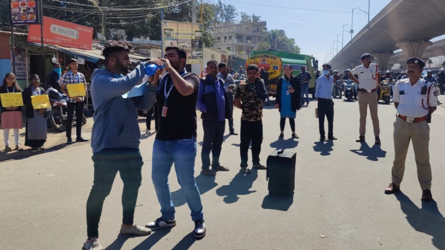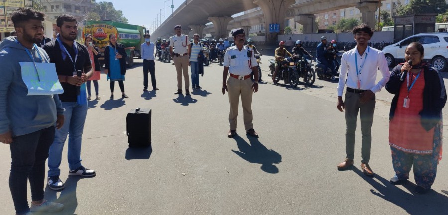 The Department of Management & Commerce, PES University, EC Campus has organized a “Traffic Awareness Program” held on 18th January, 2023. The awareness program was done at Hosa Road Junction. The main aim of the program was to make the grass root level of citizens aware of the traffic rules and the road safety measures. The students had put up a street play on “Road safety Awareness” for the general public by enacting a scenario where the traffic rules are violated by the public and how as responsible citizens we must abide by the rules. The students were very enthusiastic and scripted a plot within a short span of time. A small street play was conducted to raise awareness about the drink and drive cases. They staged a live demonstration to captivate the audience and prevent such incidents in the future. We produced some pluck cards to illustrate a few statements which read "DON'T LET CHEERS TURN INTO TEARS". "THINK AND DRIVE DON'T DRINK AND DRIVE, SO YOU TO SURVIVE". Etc. Later, a speech given by the students in different languages about Road safety and to inform drivers about the rules of the road and the importance of good choices: wearing helmets, no speeding while driving and avoiding alcohol or medications that affect awareness. At the end they concluded by singing out a few slogans.