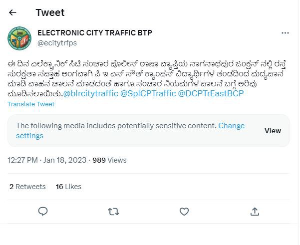 They also Tweeted about the Traffic Awareness Program put up by the Students of PES University.