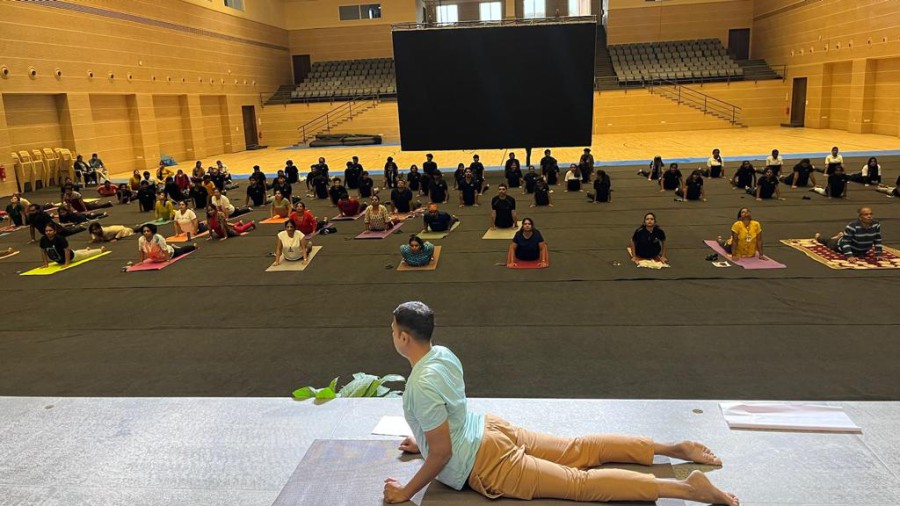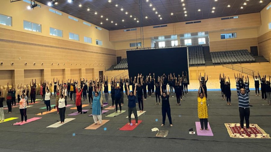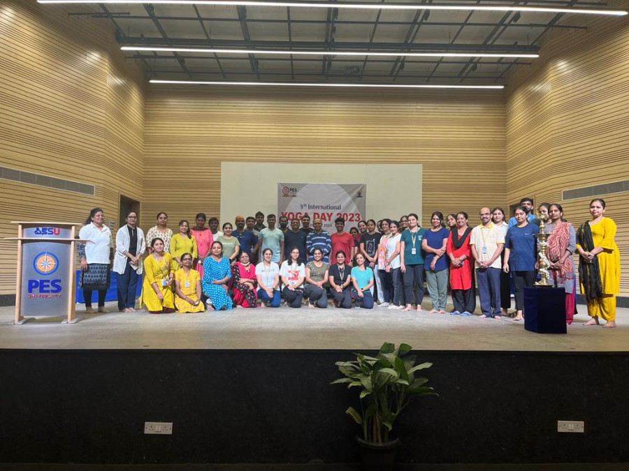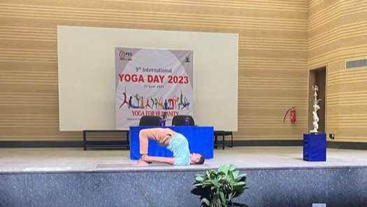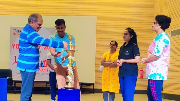 The 9th International Yoga Day was joyfully observed at MRD Student Centre in PES University EC Campus. The program commenced with the lighting of the lamp by Dr. Subhash S Kulakarni, the Principal. Attendees included chairpersons from different departments, staff, and students.