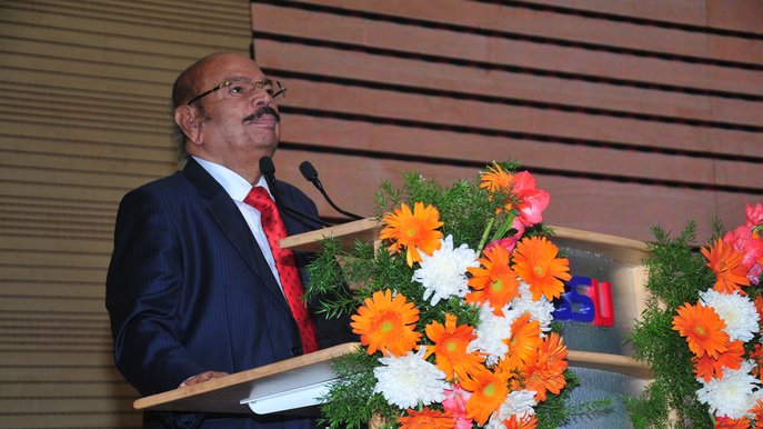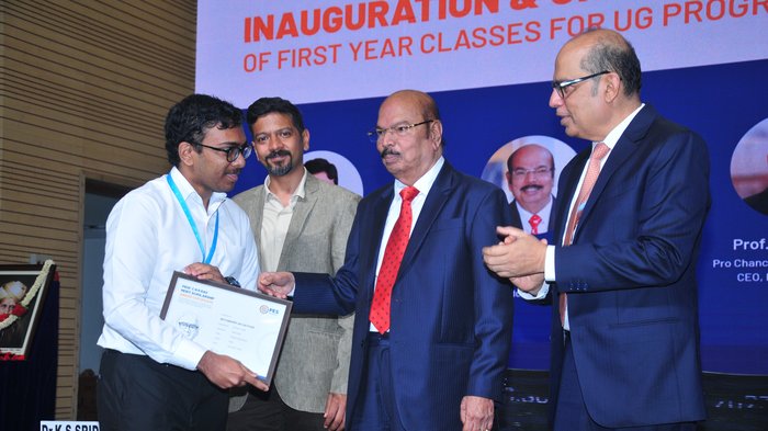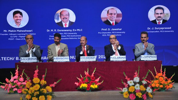 In his presidential address, Dr. M. R. Doreswamy, Chancellor of PES University said that every student should have a dream in life towards which one has to work relentlessly. He also said that success depends on not only securing good grades but also inculcating values in oneself. He advised students to have Bharata Ratna Sir. M. Visvesvaraya and Dr. Abdul Kalam as role models in their lives. He also mentioned that as engineers they have a huge responsibility towards the society, in changing the destiny of the country. He said that PES focuses on two sectors - Education and Health and emphasized that the pharma industry plays a vital role in our country by producing drugs of good standard at minimal cost. He also informed the gathering that the PES University hospital will serve people of 140 villages in and around Electronic City which consists of about 2 lakh people.