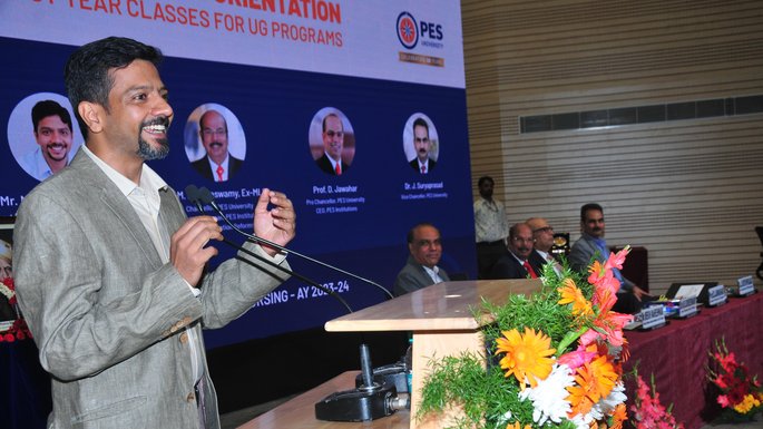 Inauguration of the First Year classes for B.Tech, B.Pharm, and BSc Nursing programs of PES University was held on Aug 27, 2023 at the Electronic City Campus. Mr. Mekin Maheshwari, Founder Udhyam Learning Foundation, alumnus of PES Institute of Technology was the chief guest on the occasion. In his address, Sri. Mekin Maheshwari said that it is very important for students to work hard and there are no shortcuts to it. He also advised the students to participate in extracurricular activities conducted in college which in turn enhances their leadership qualities. He requested the students to listen to oneself while making a decision and to aim high. He asked students to focus more on understanding the concept and building on them which enhances their ability to solve problems.