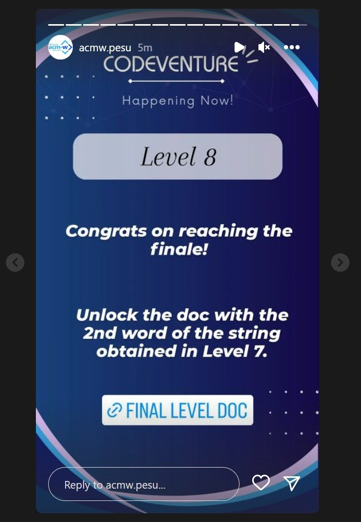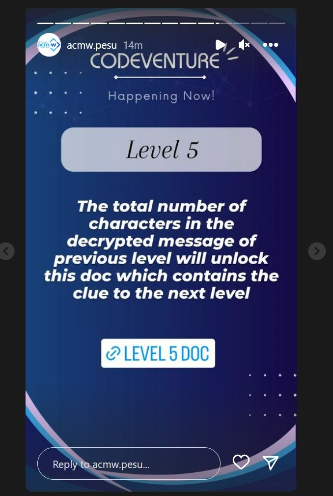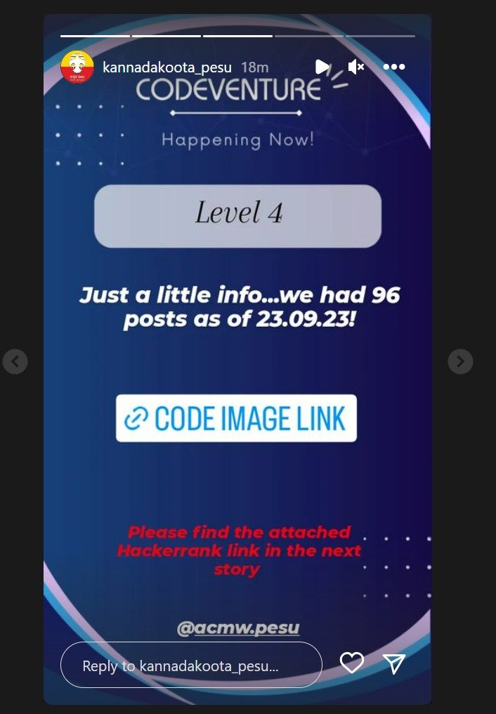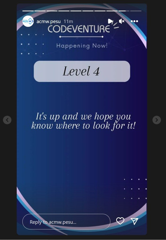 CodeVenture online coding treasure hunt saw participants curiously unravelling clues that were ingeniously shared as Instagram stories on the ACM-W Instagram page. The participants applied their coding skills to decipher the cryptic stories and come up with working code. Nine teams cleared seven challenging levels that tested their coding prowess and problem solving abilities. The top spots were bagged by: team TARS of Vyoman Jain and Samarth P, followed by team Fade boiz of Pushkar G R and Jeevan R; and team The_coders of Safwan Ahmed and Shrijit S Hunsikatti. ACM-W PES University student chapter hosted CodeVenture on Microsoft Teams and HackerRank on October 28, 2023.
