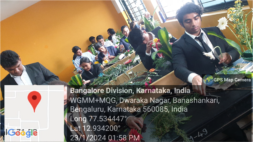 Students got hands-on experience of handling flowers and foliage in traditional, ikebana and abstract modes. The practical application of the seven main principles of floral design: proportion, scale, harmony, rhythm, balance, unity and emphasis guided the students in understanding artistic arrangements in tune with the expectations. The floral artistry workshop was organized by the department of BBA HEM on January 22-23, 2024 at RR campus.