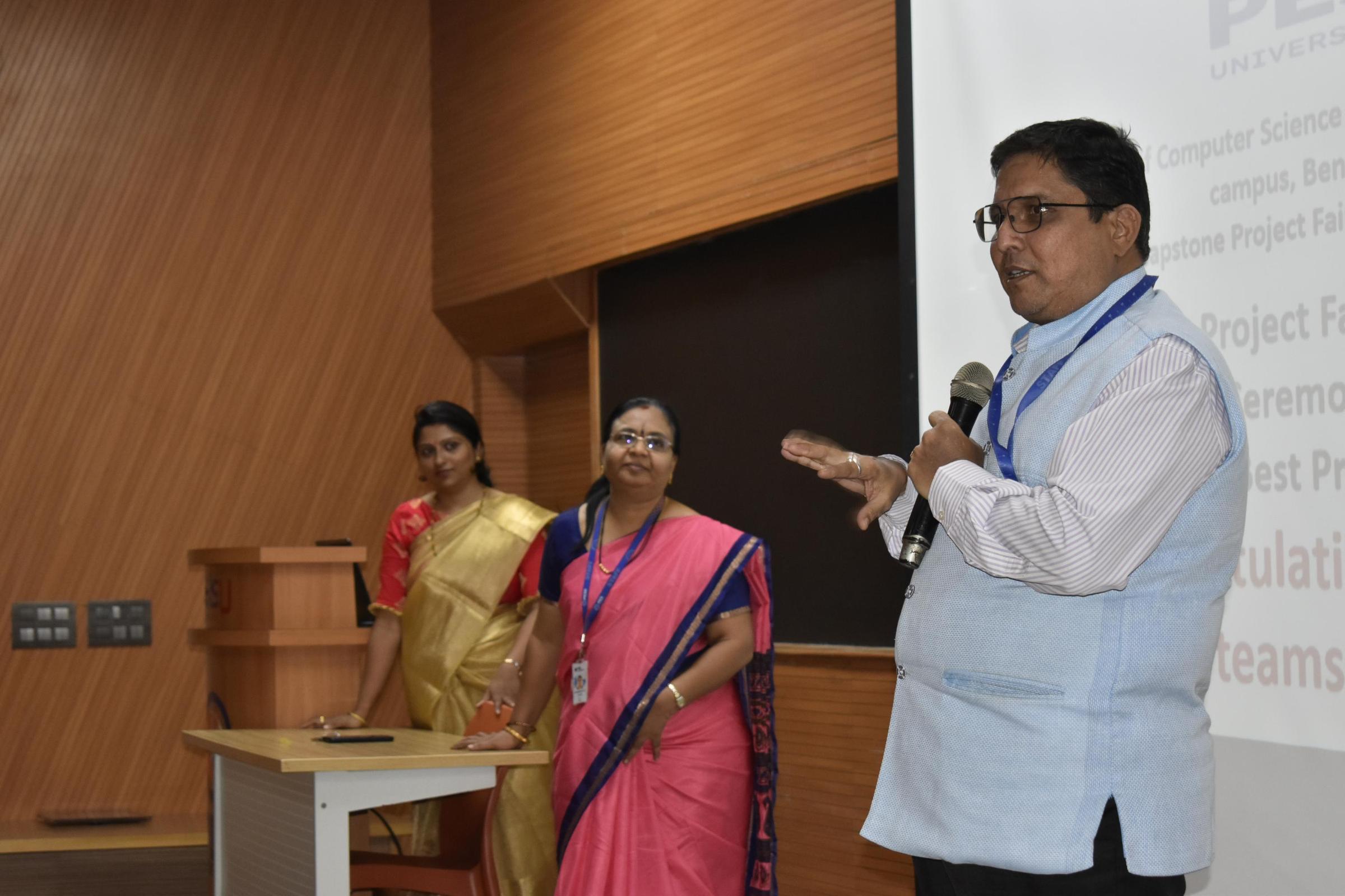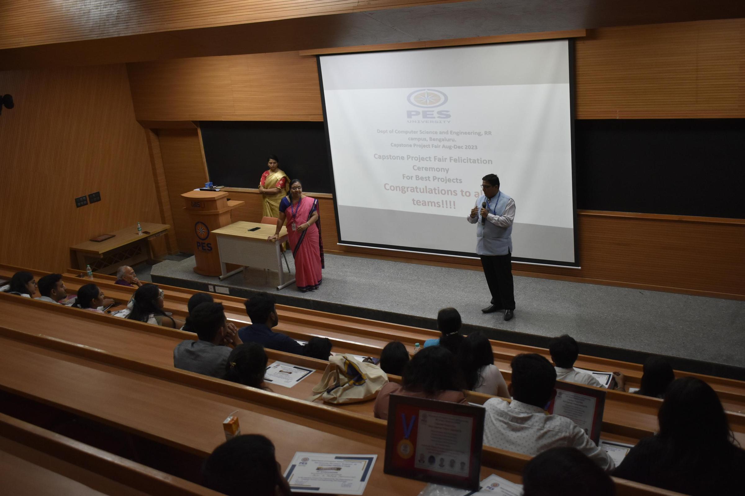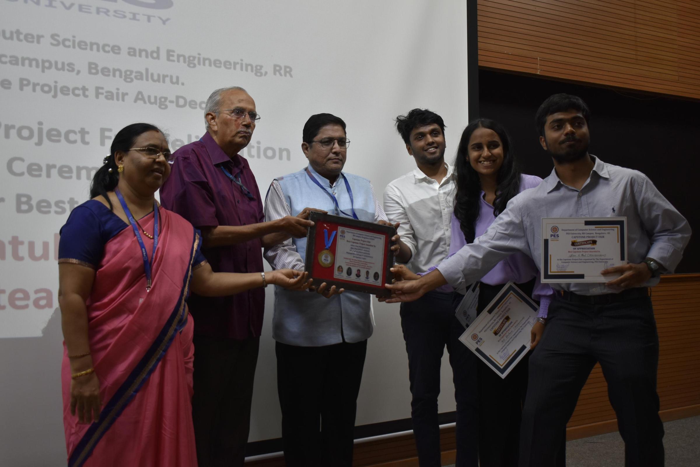 The Department of Computer Science and Engineering presented 194 projects, of which 53 most relevant projects from domains of social, environmental, medical, technology, and finance were shortlisted. The projects were evaluated by a panel of three members consisting of a professor, an alumni member, and an industry expert. The panel included industry experts from Operative System, VISA, ArtPark, Baxter, and Reliance Jio, and alumni from Pure Storage, Visa, and Cloudera as judges. The projects were judged for novelty, technical contributions, outcomes and presentation. Two teams stood out as the best in each of the domains. Dr. K. S. Sridhar, Dr. Keshavan B K and Dr. Mamatha H. R., inaugurated the event. The judges awarded the top 10 best projects and the winners were felicitated in the ceremony held February 3, 2024.
