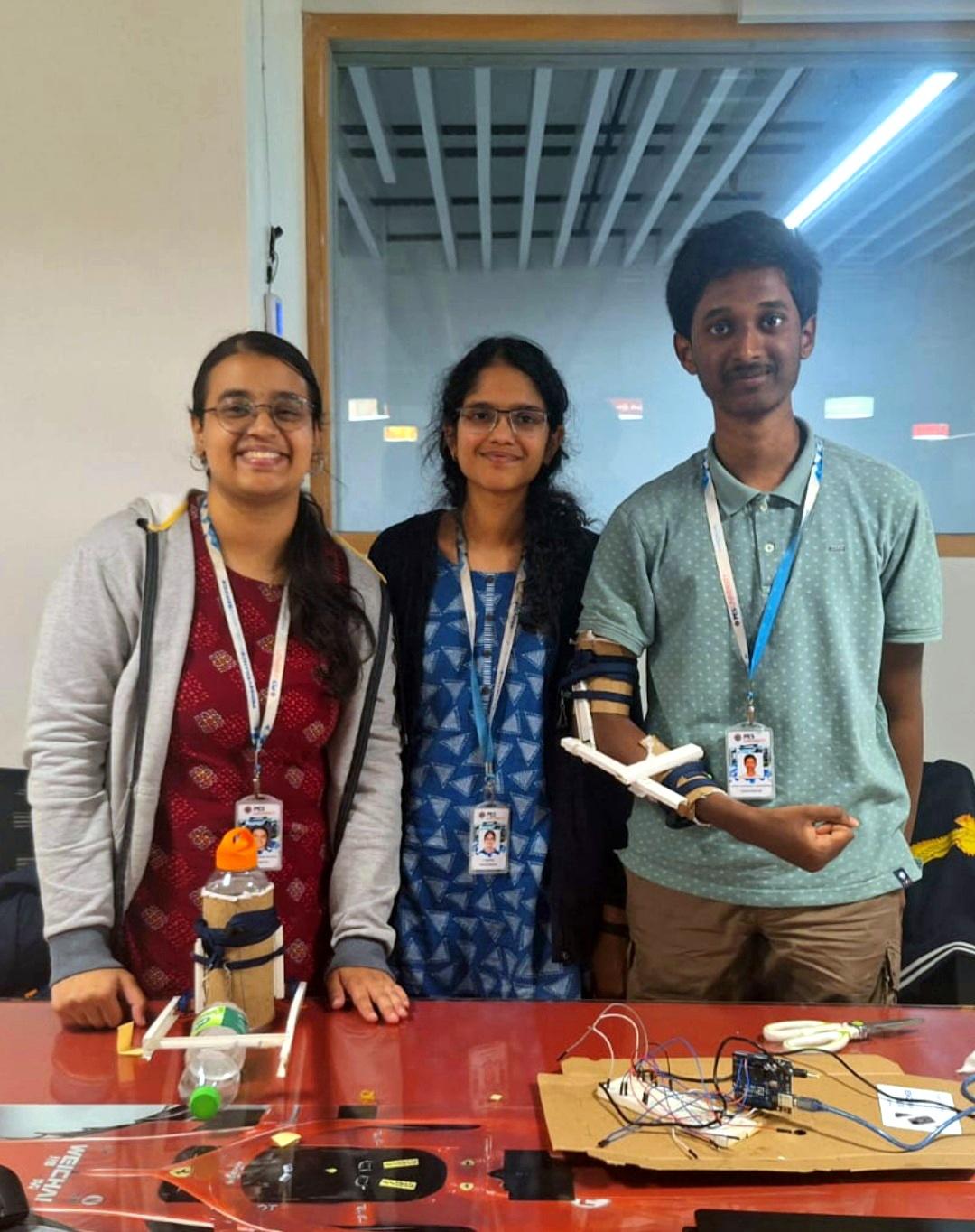 The first prize was won by the team of Vishnu Bharadwaj, Navya Tayi, and Shubha from the 8th Semester Electronics and Communication Engineering. They developed a prototype, which can mimic the notion of a healthy limb onto the injured limb thereby promoting faster recovery of the injured limb after an accident or injury.