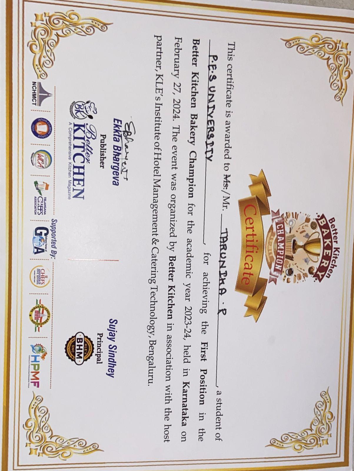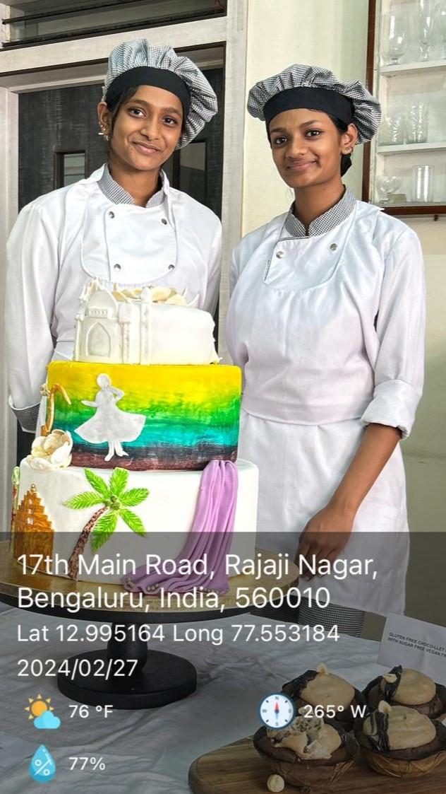 Ms.Tarunika and Ms.Prerana, students of BBA HEM won the Better Kitchen Bakery Competition. They presented chocolate and millet gluten free cupcakes with sugar free frosting served in a leaf cup, Indian and Italian lavash and breadsticks and a three tiered around India tourism themed cake. The leaf cups for cupcake as a sustainable approach impressed the jury. Better Kitchen Bakery Competition was held at KLE college, Bengaluru on February 27, 2024.