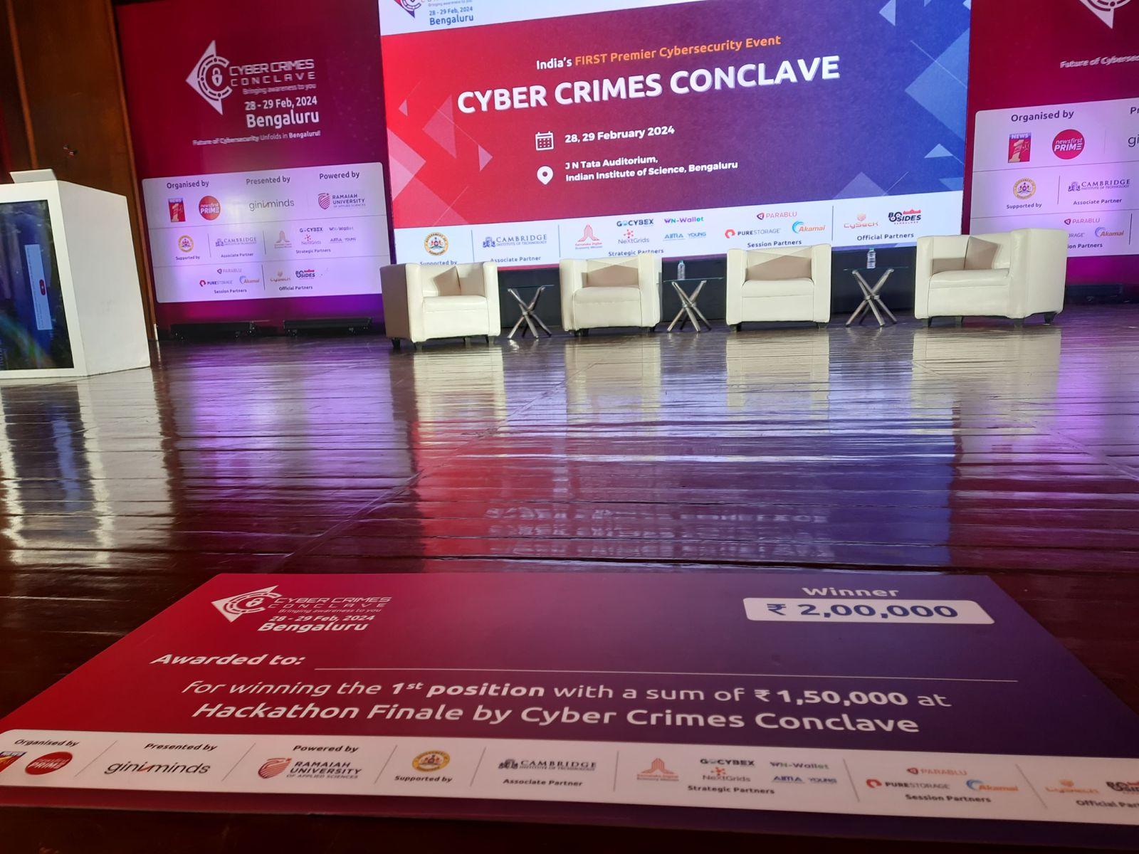 Four students from the Department of CSE Students have won the 1st position at the Cyber Crimes Conclave ‘24 Organised by News1st Channel and supported by the Govt. Of Karnataka and secured a prize money of INR 2,00,000.