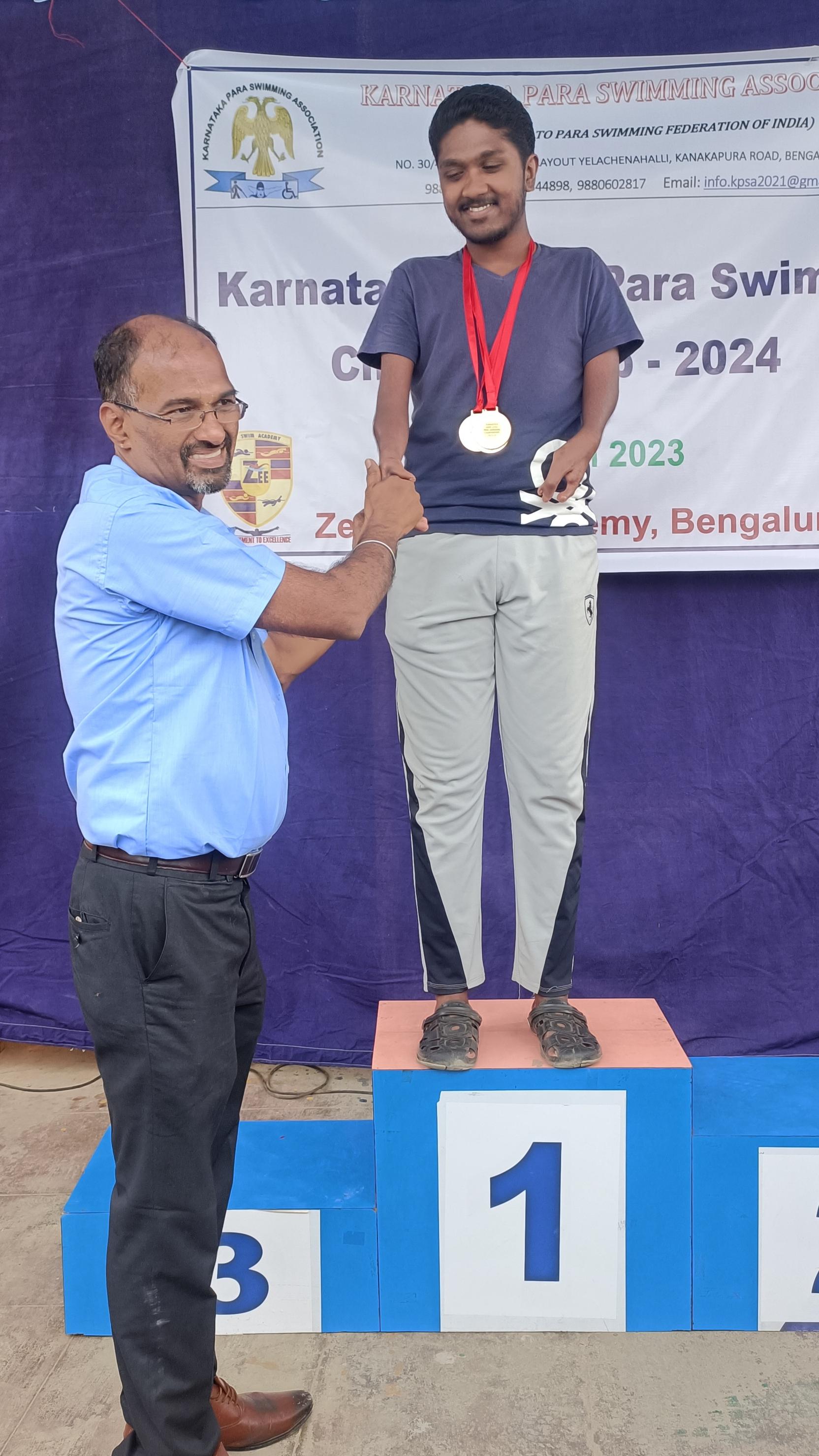 Naveen Venkatesh student from PES University’s B.Com program has won three Gold Medals in 23rd State Level Para Swimming Championship 2024.