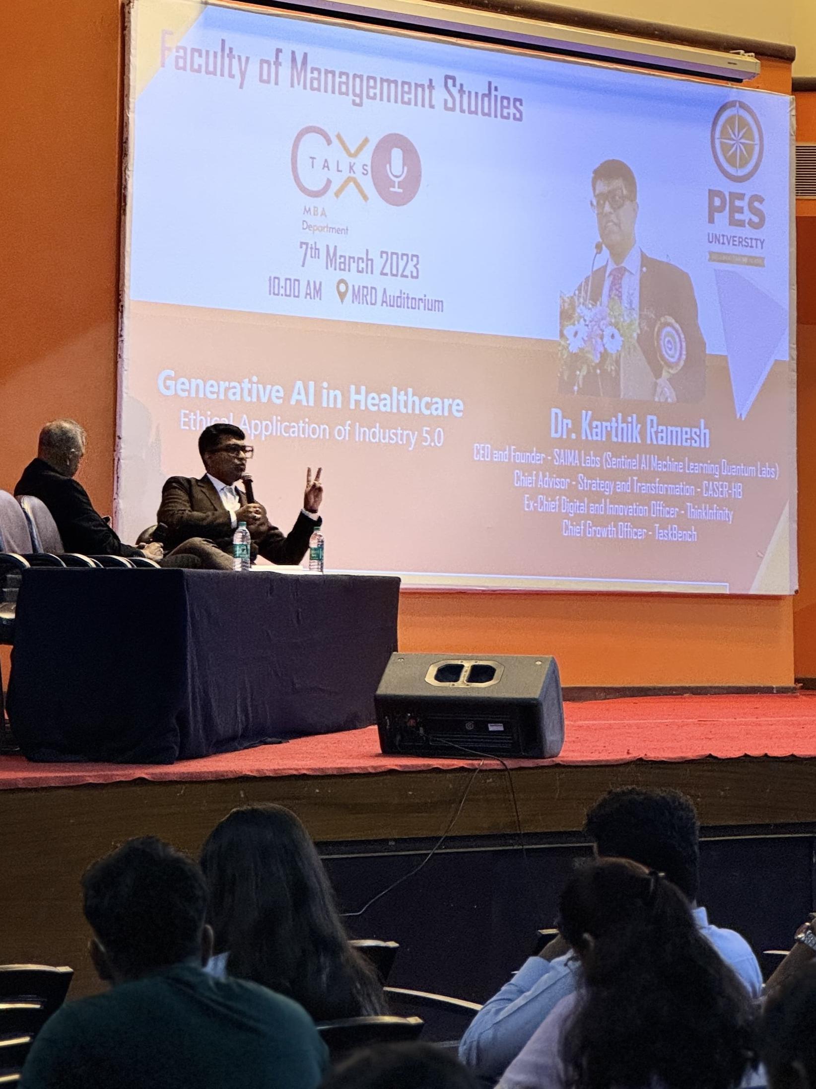 The speaker, Dr. Karthik Ramesh highlighted the potential of AI in revolutionizing healthcare while stressing the importance of human involvement. He supported a balanced approach to AI adoption which addressed ethical considerations such as robo-rights and fair evaluation. He explored the merging realms of healthcare and management amidst the digital era for optimal results. Through practical examples and case studies, ways to leverage technology to improve patient care while tackling organizational hurdles were examined. The talk highlighted the significance of interdisciplinary approach in navigating the complexities of healthcare systems. Dr. Karthik Ramesh’s whose notable achievements include organizing India’s first hackathon and reducing diabetes cases through AI spoke in the CXO talks series organized by Department of BBA on March 7, 2024 at RR campus.