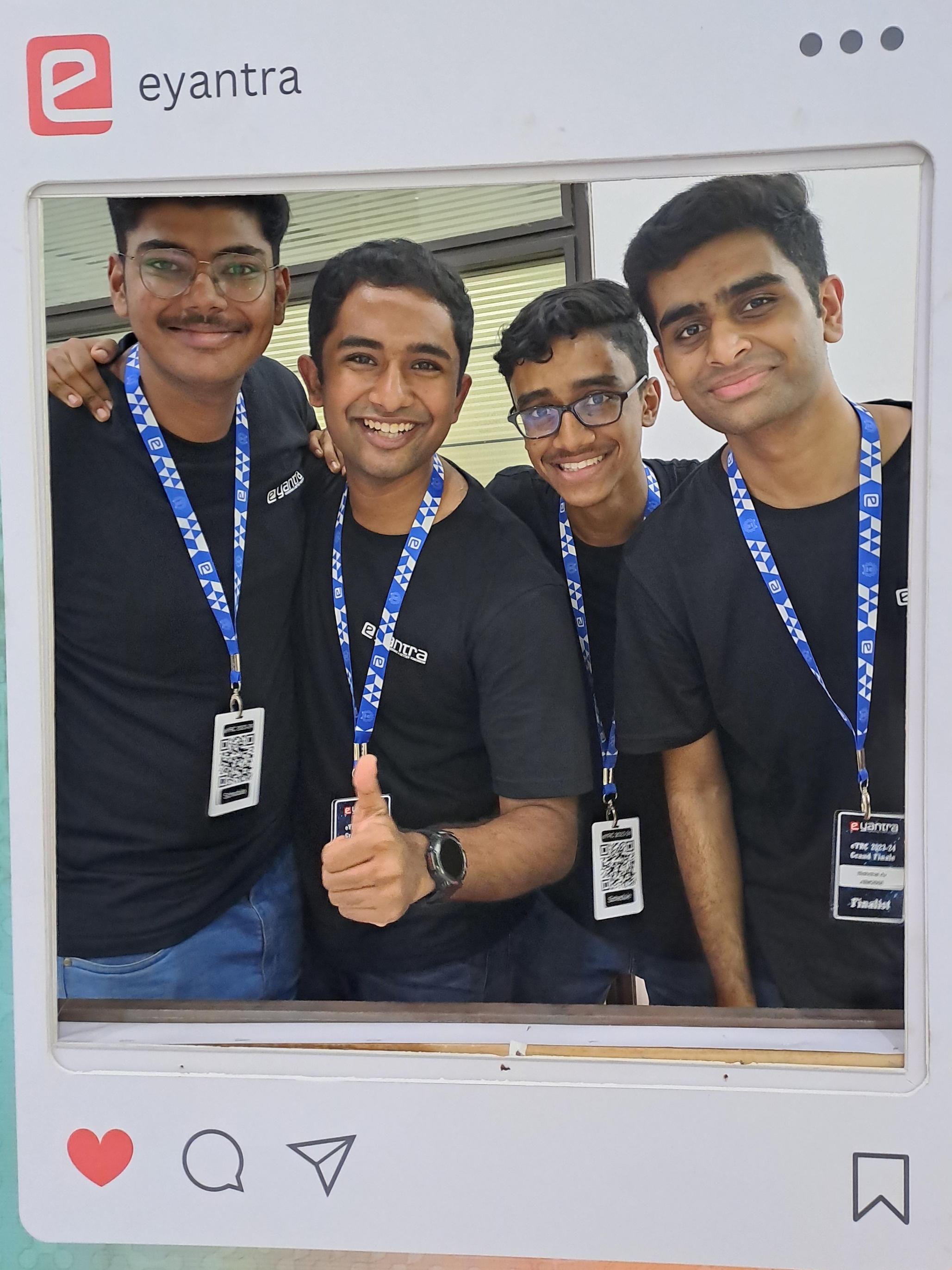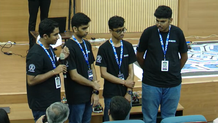 The team of Gautham Varma K, Nikhil R, Nishchal A V and Kaushik M won first prize in e-Yantra competition conducted by IIT Bombay. The competition for engineering students consisted of two stages over a six month period. The jury of industry experts and faculty of IITB interviewed the contesting teams asking questions on methodology and bot, algorithm and CPU designs as submitted under the theme of Astro Tinker Bot. The grand finale of e-yantra was held on March 22-23, 2024 at IIT Bombay.