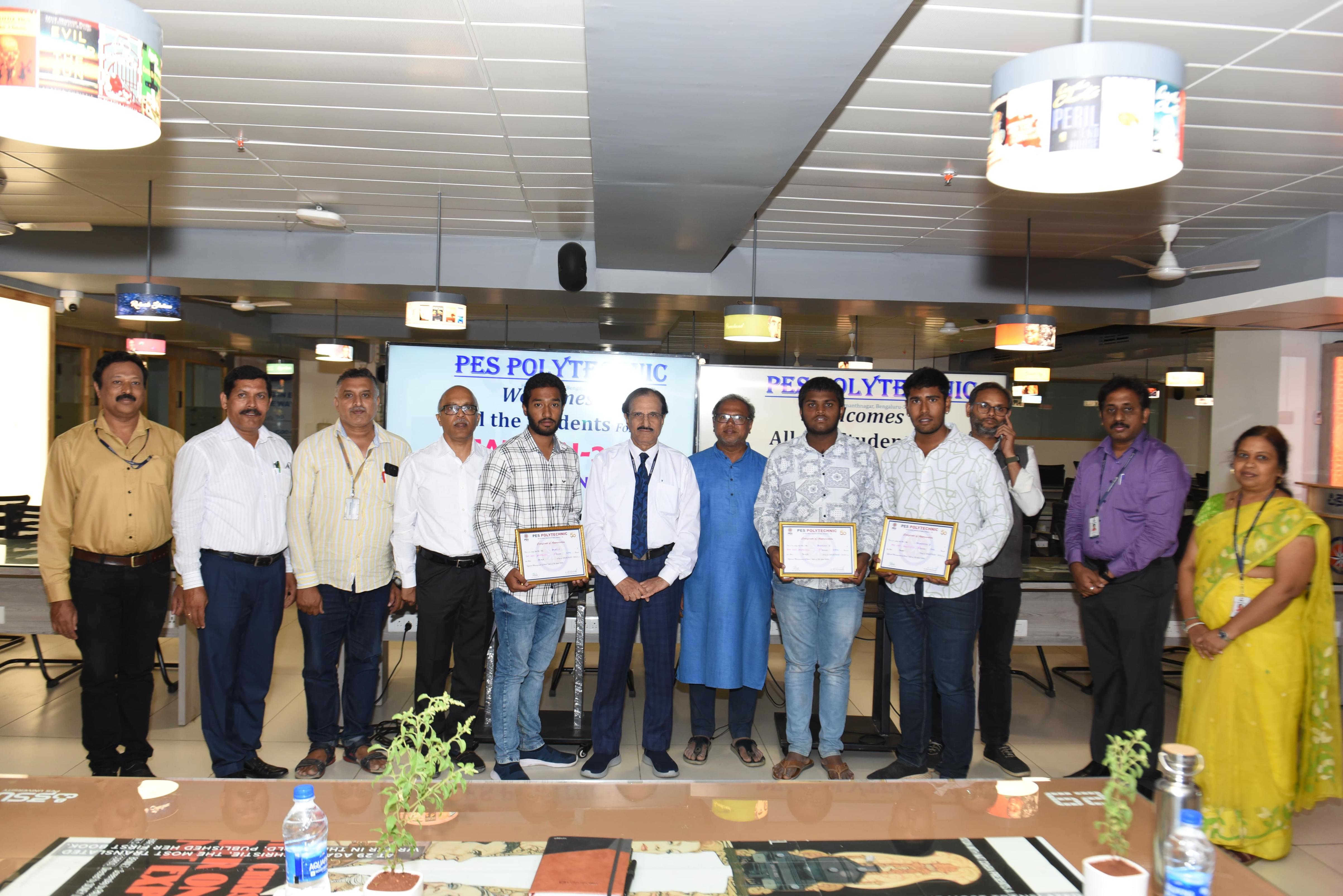 Sri Nitesh Kumar, Sri Suman KT, and Sri Manoj Kumar from the 4th Semester Mechanical Engineering students of PES Polytechnic bagged the second prize for their idea on Pervious concrete for subway roads and interior roads in the apartment complex.