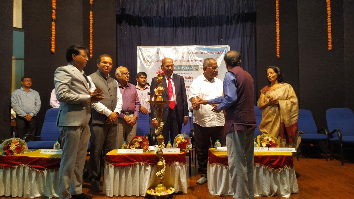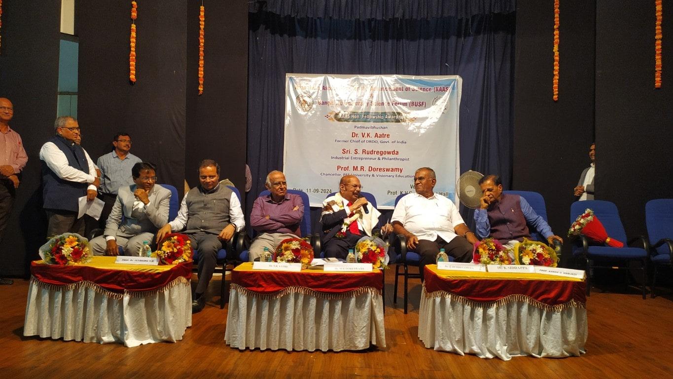ಕರ್ನಾಟಕ ಅಸೋಸಿಯೇಷನ್ ಫಾರ್ ದಿ ಅಡ್ವಾನ್ಸ್ಮೆಂಟ್ ಆಫ್ ಸೈನ್ಸ್ ಮತ್ತು ಬೆಂಗಳೂರು ವಿಶ್ವವಿದ್ಯಾಲಯ ವಿಜ್ಞಾನ ವೇದಿಕೆ ಸಹಯೋಗದಲ್ಲಿ ವಿಜ್ಞಾನ, ತಂತ್ರಜ್ಞಾನ,ಶಿಕ್ಷಣ ಕ್ಷೇತ್ರದಲ್ಲಿನ ಸಾಧನೆಗಾಗಿ ಪದ್ಮವಿಭೂಷಣ ಡಾ.ವಿ.ಕೆ ಆತ್ರೆ,ಪಿಇಎಸ್ ವಿಶ್ವವಿದ್ಯಾಲಯದ ಕುಲಾಧಿಪತಿಗಳು ಡಾ.ಎಂ.ಆರ್.ದೊರೆಸ್ವಾಮಿ ಮತ್ತು ಕೈಗಾರಿಕೋದ್ಯಮಿ ಎಸ್.ರುದ್ರೇಗೌಡರವರಿಗೆ ಗೌರವ ಫೆಲೋಶಿಪ್ ಪ್ರಶಸ್ತಿ ಪ್ರದಾನ ಮಾಡಿ ಸನ್ಮಾನಿಸಲಾಯಿತು.