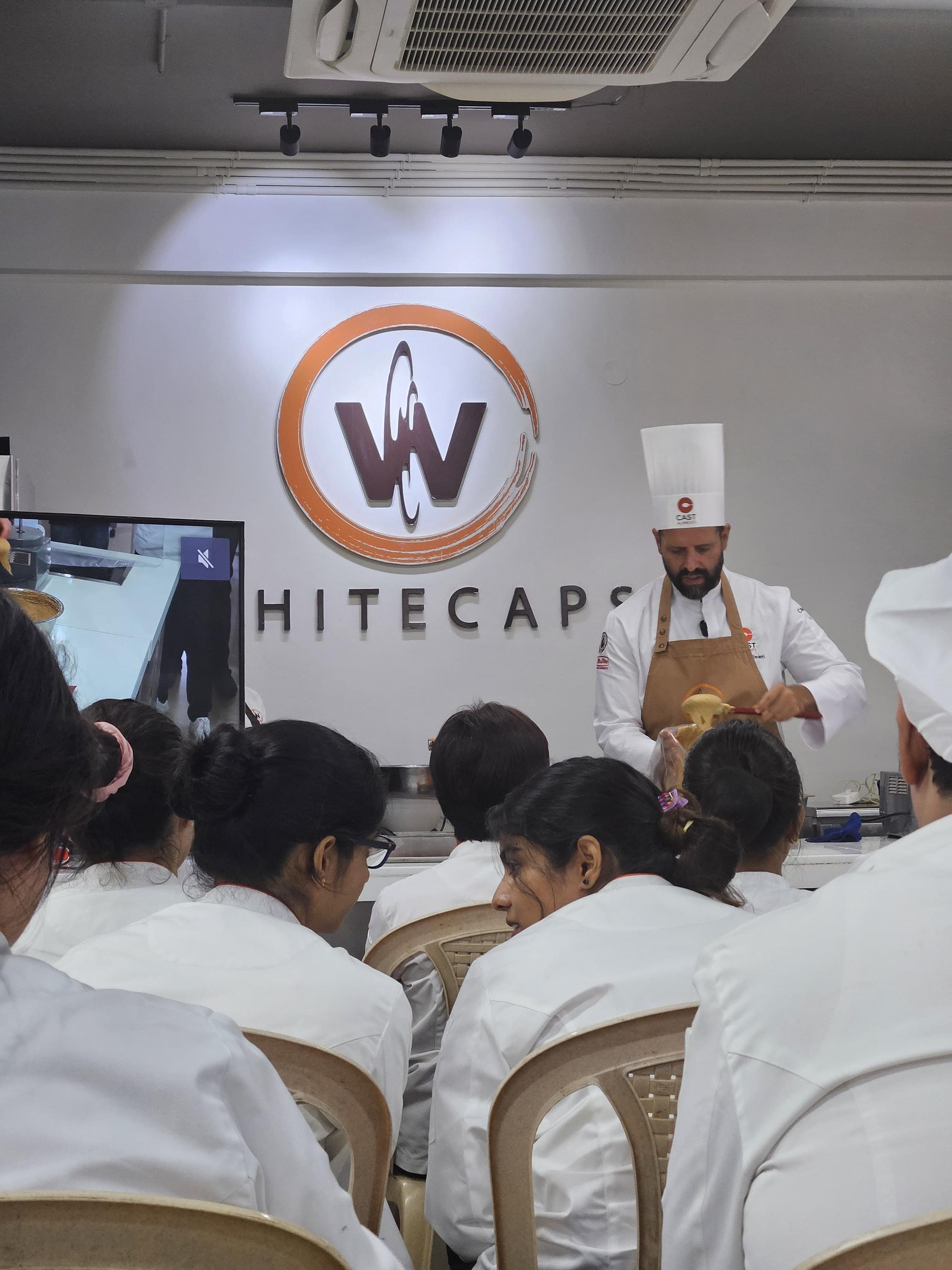 Students of BBA-HEM got an opportunity to learn more about advanced chocolate tempering techniques, balancing of flavors and textures in baking and techniques for delicate pastries presentation. The workshop at Whitecaps International School of Pastry was conducted by Chef Vittorio Santoro, Founder, Cast Alimenti, Italy on September 12, 2024.